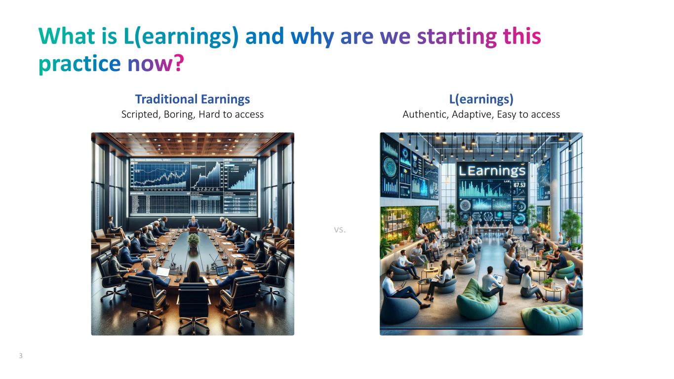 What is L(earnings) and why are we starting this practice now? Traditional Earnings Scripted, Boring, Hard to access L(earnings) Authentic, Adaptive, Easy to access 3 vs.