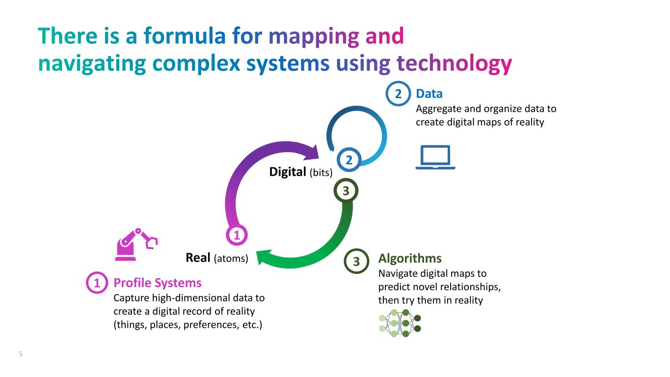 There is a formula for mapping and navigating complex systems using technology Digital (bits) Data Aggregate and organize data to create digital maps of reality 2 2 Real (atoms) 1 Profile Systems Capture high-dimensional data to create a digital record of reality (things, places, preferences, etc.) 1 Algorithms Navigate digital maps to predict novel relationships, then try them in reality 3 3 5