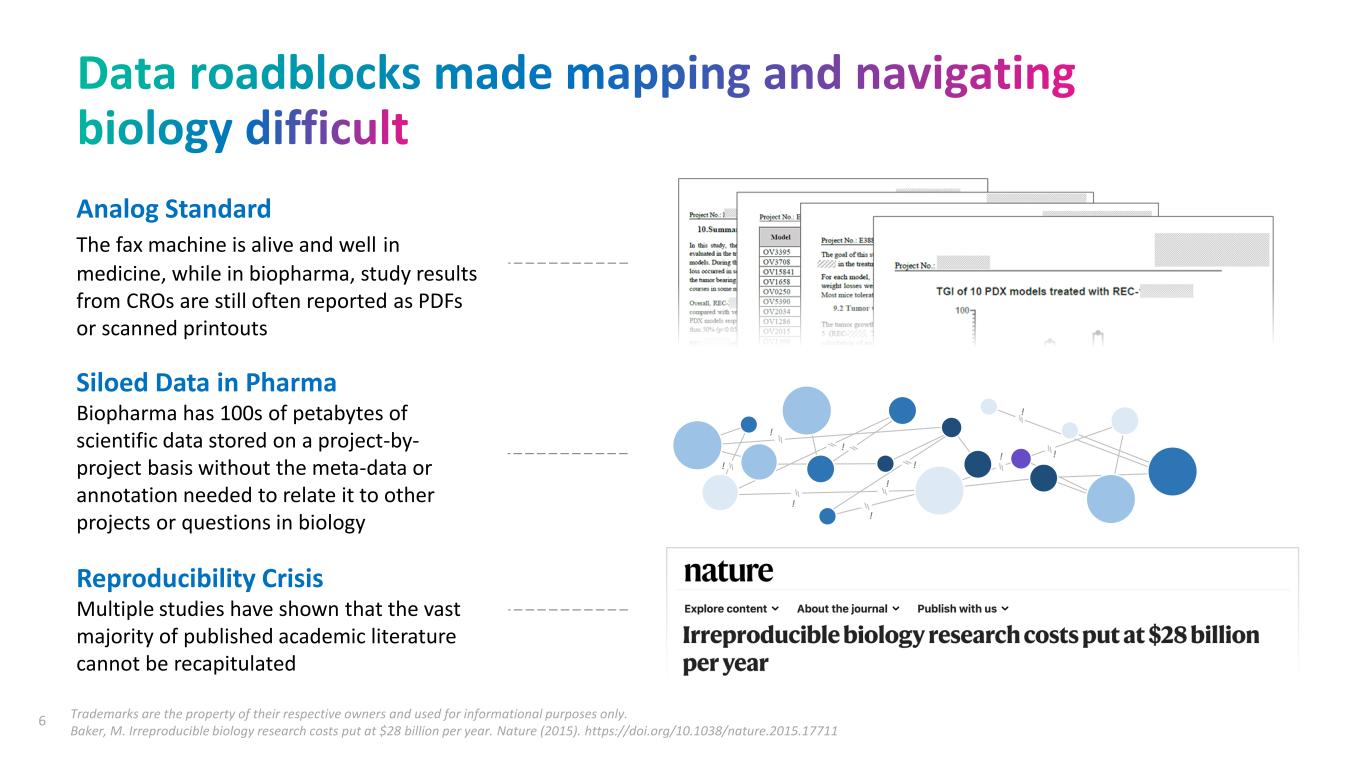 Data roadblocks made mapping and navigating biology difficult Reproducibility Crisis Multiple studies have shown that the vast majority of published academic literature cannot be recapitulated Analog Standard The fax machine is alive and well in medicine, while in biopharma, study results from CROs are still often reported as PDFs or scanned printouts Siloed Data in Pharma Biopharma has 100s of petabytes of scientific data stored on a project-by- project basis without the meta-data or annotation needed to relate it to other projects or questions in biology ! ! ! ! ! ! ! ! ! ! Trademarks are the property of their respective owners and used for informational purposes only. Baker, M. Irreproducible biology research costs put at $28 billion per year. Nature (2015). https://doi.org/10.1038/nature.2015.17711 6