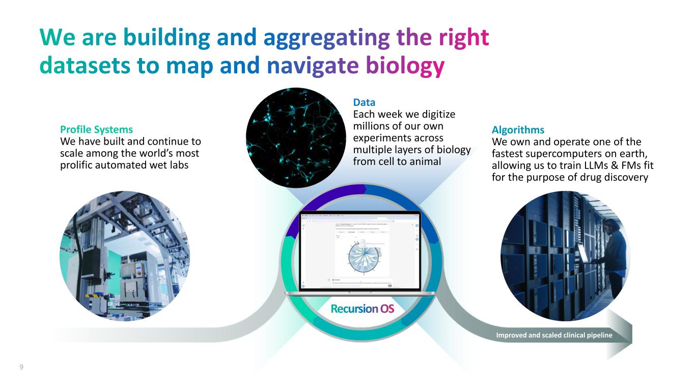 Data Each week we digitize millions of our own experiments across multiple layers of biology from cell to animal Improved and scaled clinical pipeline We are building and aggregating the right datasets to map and navigate biology Recursion OS 9 Algorithms We own and operate one of the fastest supercomputers on earth, allowing us to train LLMs & FMs fit for the purpose of drug discovery Profile Systems We have built and continue to scale among the world’s most prolific automated wet labs