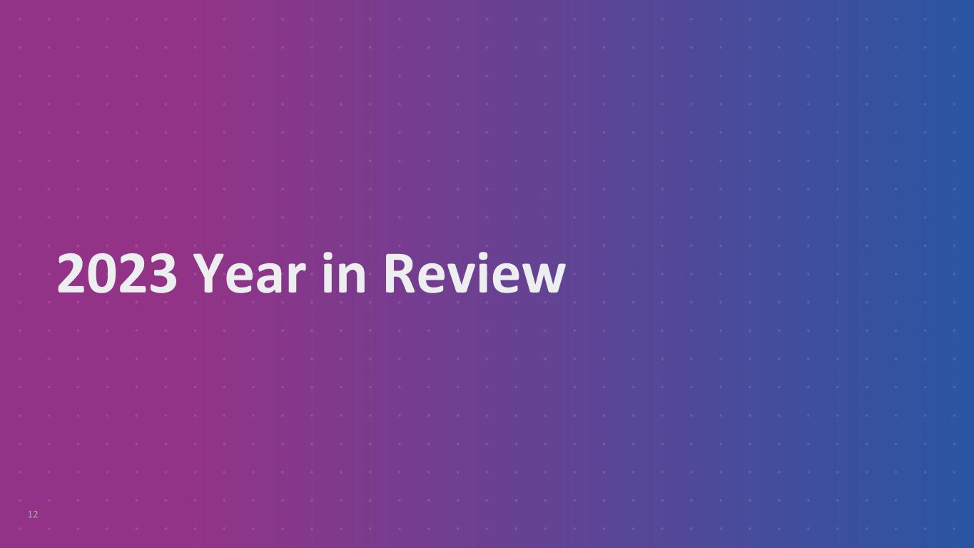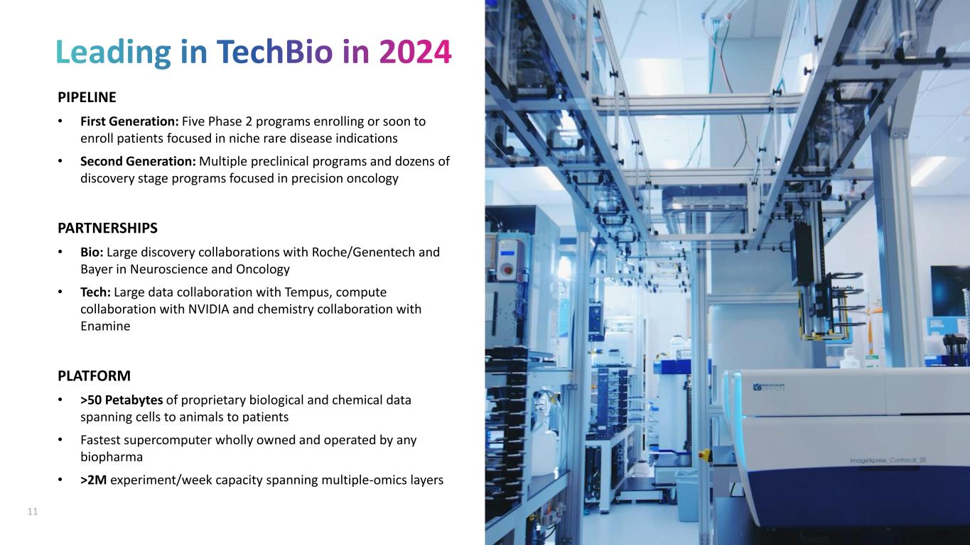 PIPELINE • First Generation: Five Phase 2 programs enrolling or soon to enroll patients focused in niche rare disease indications • Second Generation: Multiple preclinical programs and dozens of discovery stage programs focused in precision oncology PARTNERSHIPS • Bio: Large discovery collaborations with Roche/Genentech and Bayer in Neuroscience and Oncology • Tech: Large data collaboration with Tempus, compute collaboration with NVIDIA and chemistry collaboration with Enamine PLATFORM • >50 Petabytes of proprietary biological and chemical data spanning cells to animals to patients • Fastest supercomputer wholly owned and operated by any biopharma • >2M experiment/week capacity spanning multiple-omics layers 11 Leading in TechBio in 2024
