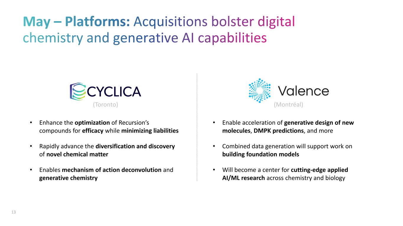 (Toronto) (Montréal) • Enhance the optimization of Recursion’s compounds for efficacy while minimizing liabilities • Rapidly advance the diversification and discovery of novel chemical matter • Enables mechanism of action deconvolution and generative chemistry • Enable acceleration of generative design of new molecules, DMPK predictions, and more • Combined data generation will support work on building foundation models • Will become a center for cutting-edge applied AI/ML research across chemistry and biology 13 May – Platforms: Acquisitions bolster digital chemistry and generative AI capabilities