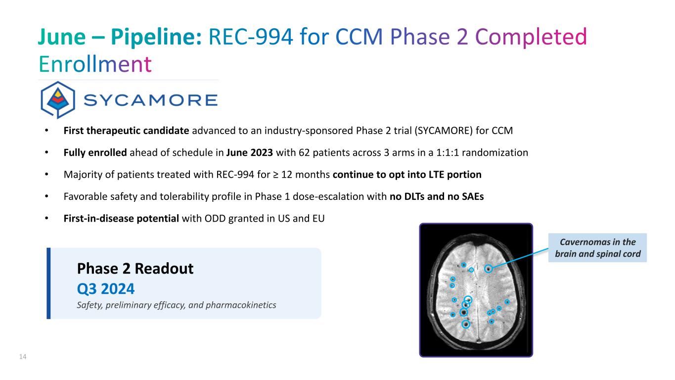 June – Pipeline: REC-994 for CCM Phase 2 Completed Enrollment • First therapeutic candidate advanced to an industry-sponsored Phase 2 trial (SYCAMORE) for CCM • Fully enrolled ahead of schedule in June 2023 with 62 patients across 3 arms in a 1:1:1 randomization • Majority of patients treated with REC-994 for ≥ 12 months continue to opt into LTE portion • Favorable safety and tolerability profile in Phase 1 dose-escalation with no DLTs and no SAEs • First-in-disease potential with ODD granted in US and EU Phase 2 Readout Q3 2024 Safety, preliminary efficacy, and pharmacokinetics 14 Cavernomas in the brain and spinal cord