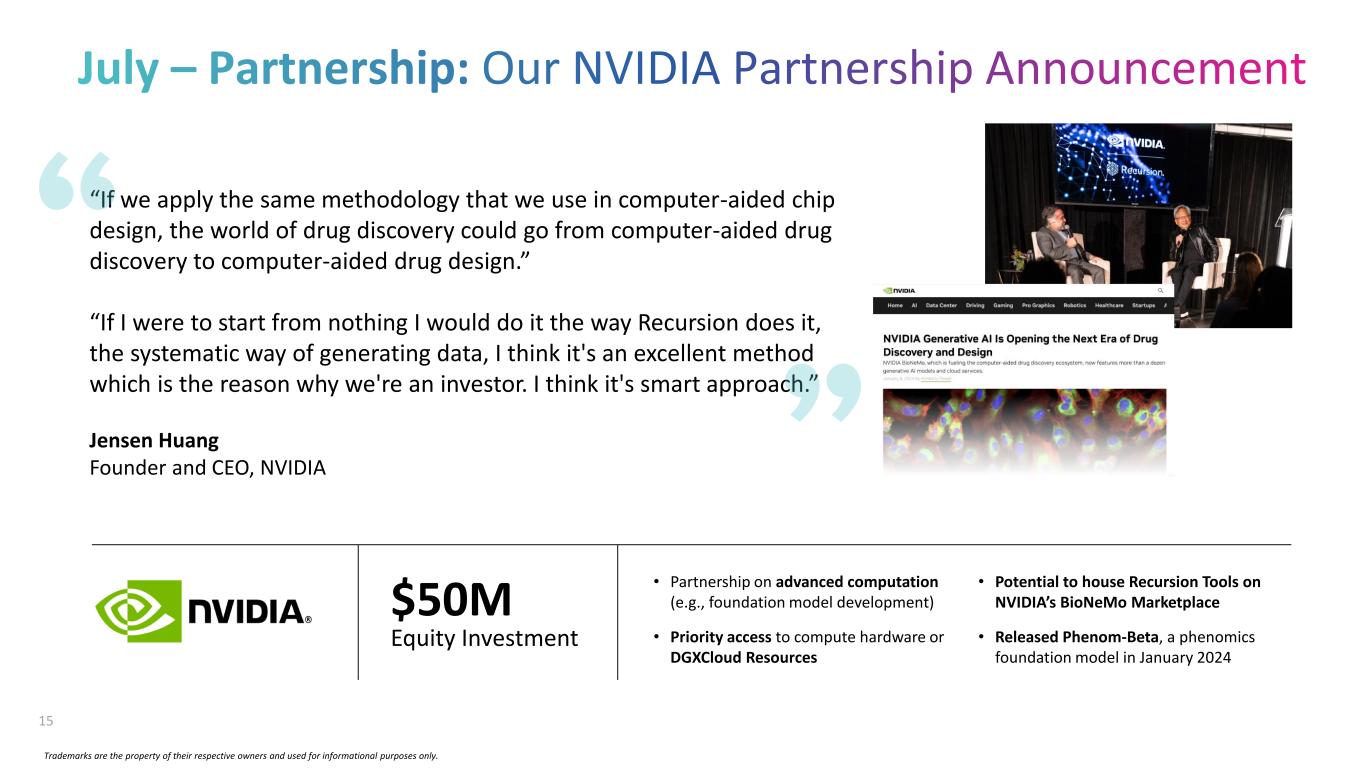 Trademarks are the property of their respective owners and used for informational purposes only. • Partnership on advanced computation (e.g., foundation model development) • Priority access to compute hardware or DGXCloud Resources “If we apply the same methodology that we use in computer-aided chip design, the world of drug discovery could go from computer-aided drug discovery to computer-aided drug design.” “If I were to start from nothing I would do it the way Recursion does it, the systematic way of generating data, I think it's an excellent method which is the reason why we're an investor. I think it's smart approach.” Jensen Huang Founder and CEO, NVIDIA 15 July – Partnership: Our NVIDIA Partnership Announcement $50M Equity Investment • Potential to house Recursion Tools on NVIDIA’s BioNeMo Marketplace • Released Phenom-Beta, a phenomics foundation model in January 2024