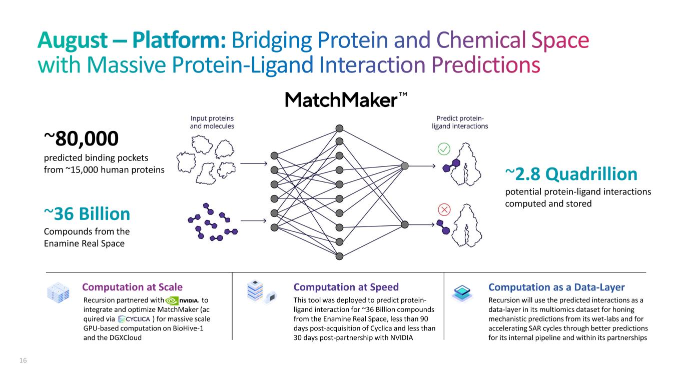 ~36 Billion Compounds from the Enamine Real Space ~80,000 predicted binding pockets from ~15,000 human proteins ~2.8 Quadrillion potential protein-ligand interactions computed and stored Recursion partnered with to integrate and optimize MatchMaker (ac quired via ) for massive scale GPU-based computation​ on BioHive-1 and the DGXCloud This tool was deployed to predict protein- ligand interaction for ~36 Billion compounds from the Enamine Real Space, less than 90 days post-acquisition of Cyclica and less than 30 days post-partnership with NVIDIA Recursion will use the predicted interactions as a data-layer in its multiomics dataset for honing mechanistic predictions from its wet-labs and for accelerating SAR cycles through better predictions for its internal pipeline and within its partnerships​ Computation at Scale Computation at Speed Computation as a Data-Layer 16 August – Platform: Bridging Protein and Chemical Space with Massive Protein-Ligand Interaction Predictions