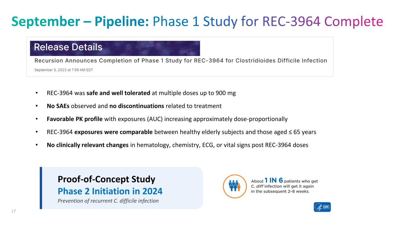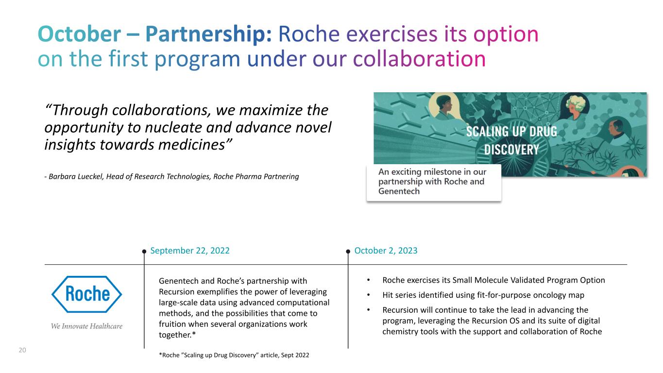 • Roche exercises its Small Molecule Validated Program Option • Hit series identified using fit-for-purpose oncology map • Recursion will continue to take the lead in advancing the program, leveraging the Recursion OS and its suite of digital chemistry tools with the support and collaboration of Roche Genentech and Roche’s partnership with Recursion exemplifies the power of leveraging large-scale data using advanced computational methods, and the possibilities that come to fruition when several organizations work together.* *Roche ”Scaling up Drug Discovery” article, Sept 2022 20 October – Partnership: Roche exercises its option on the first program under our collaboration “Through collaborations, we maximize the opportunity to nucleate and advance novel insights towards medicines” - Barbara Lueckel, Head of Research Technologies, Roche Pharma Partnering September 22, 2022 October 2, 2023