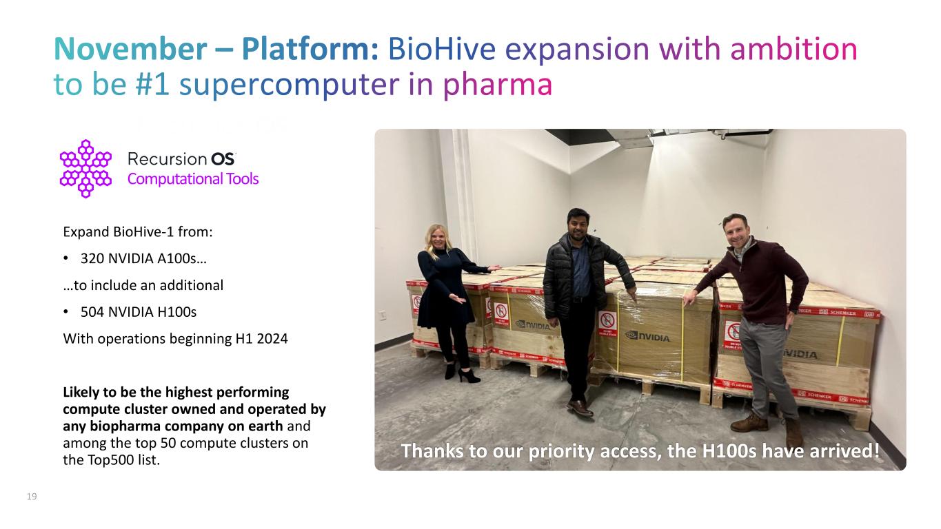 Computational Tools Expand BioHive-1 from: • 320 NVIDIA A100s… …to include an additional • 504 NVIDIA H100s With operations beginning H1 2024 Likely to be the highest performing compute cluster owned and operated by any biopharma company on earth and among the top 50 compute clusters on the Top500 list. Thanks to our priority access, the H100s have arrived! 19 November – Platform: BioHive expansion with ambition to be #1 supercomputer in pharma