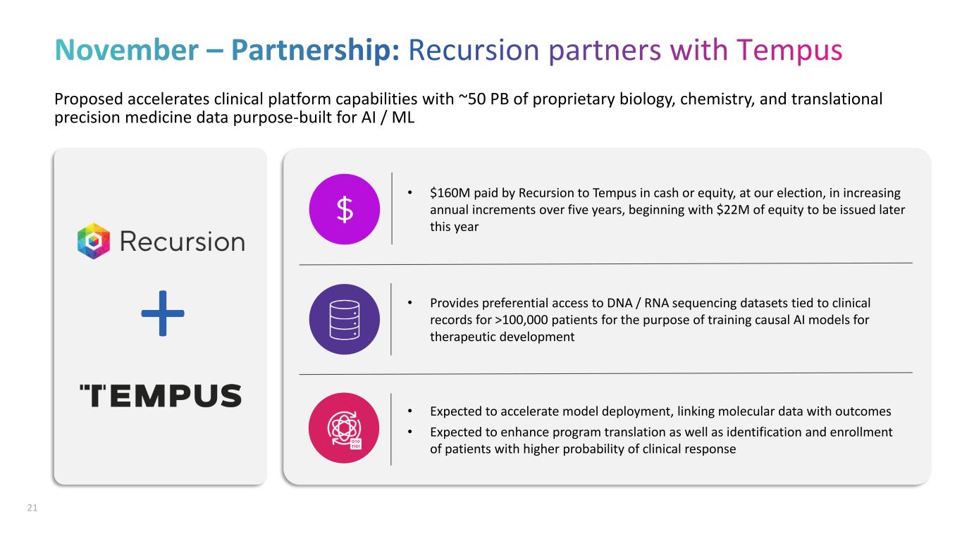 + • $160M paid by Recursion to Tempus in cash or equity, at our election, in increasing annual increments over five years, beginning with $22M of equity to be issued later this year • Expected to accelerate model deployment, linking molecular data with outcomes • Expected to enhance program translation as well as identification and enrollment of patients with higher probability of clinical response • Provides preferential access to DNA / RNA sequencing datasets tied to clinical records for >100,000 patients for the purpose of training causal AI models for therapeutic development Proposed accelerates clinical platform capabilities with ~50 PB of proprietary biology, chemistry, and translational precision medicine data purpose-built for AI / ML 21 November – Partnership: Recursion partners with Tempus