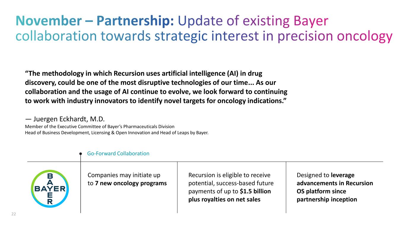 “The methodology in which Recursion uses artificial intelligence (AI) in drug discovery, could be one of the most disruptive technologies of our time... As our collaboration and the usage of AI continue to evolve, we look forward to continuing to work with industry innovators to identify novel targets for oncology indications.” — Juergen Eckhardt, M.D. Member of the Executive Committee of Bayer’s Pharmaceuticals Division Head of Business Development, Licensing & Open Innovation and Head of Leaps by Bayer. 22 November – Partnership: Update of existing Bayer collaboration towards strategic interest in precision oncology Companies may initiate up to 7 new oncology programs Go-Forward Collaboration Recursion is eligible to receive potential, success-based future payments of up to $1.5 billion plus royalties on net sales Designed to leverage advancements in Recursion OS platform since partnership inception