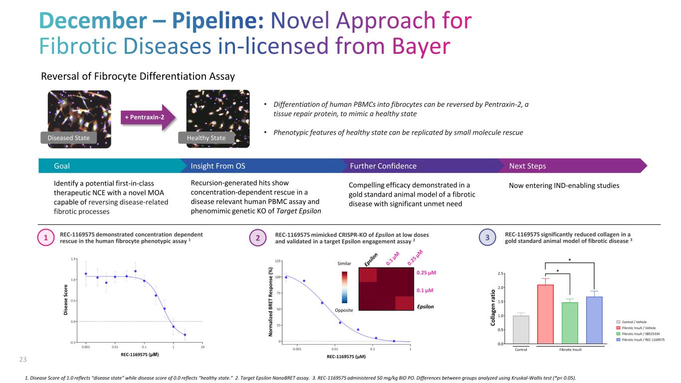 Next StepsFurther Confidence Reversal of Fibrocyte Differentiation Assay Identify a potential first-in-class therapeutic NCE with a novel MOA capable of reversing disease-related fibrotic processes Recursion-generated hits show concentration-dependent rescue in a disease relevant human PBMC assay and phenomimic genetic KO of Target Epsilon Compelling efficacy demonstrated in a gold standard animal model of a fibrotic disease with significant unmet need Now entering IND-enabling studies + Pentraxin-2 • Differentiation of human PBMCs into fibrocytes can be reversed by Pentraxin-2, a tissue repair protein, to mimic a healthy state • Phenotypic features of healthy state can be replicated by small molecule rescue REC-1169575 demonstrated concentration dependent rescue in the human fibrocyte phenotypic assay 11 REC-1169575 mimicked CRISPR-KO of Epsilon at low doses and validated in a target Epsilon engagement assay 2 0.25 µM 0.1 µM Epsilon 2 Similar Opposite REC-1169575 significantly reduced collagen in a gold standard animal model of fibrotic disease 33 1. Disease Score of 1.0 reflects “disease state” while disease score of 0.0 reflects “healthy state.” 2. Target Epsilon NanoBRET assay. 3. REC-1169575 administered 50 mg/kg BID PO. Differences between groups analyzed using Kruskal-Wallis test (*p< 0.05). 23 December – Pipeline: Novel Approach for Fibrotic Diseases in-licensed from Bayer Insight From OSGoal Diseased State Healthy State
