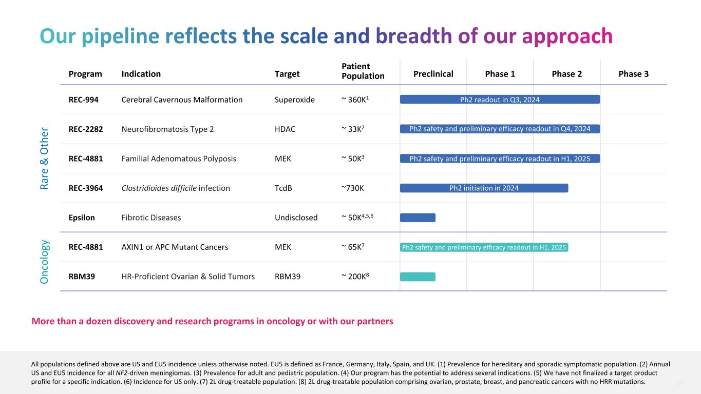 25 More than a dozen discovery and research programs in oncology or with our partners All populations defined above are US and EU5 incidence unless otherwise noted. EU5 is defined as France, Germany, Italy, Spain, and UK. (1) Prevalence for hereditary and sporadic symptomatic population. (2) Annual US and EU5 incidence for all NF2-driven meningiomas. (3) Prevalence for adult and pediatric population. (4) Our program has the potential to address several indications. (5) We have not finalized a target product profile for a specific indication. (6) Incidence for US only. (7) 2L drug-treatable population. (8) 2L drug-treatable population comprising ovarian, prostate, breast, and pancreatic cancers with no HRR mutations. Program Indication Target Patient Population Preclinical Phase 1 Phase 2 Phase 3 REC-994 Cerebral Cavernous Malformation Superoxide ~ 360K1 REC-2282 Neurofibromatosis Type 2 HDAC ~ 33K2 REC-4881 Familial Adenomatous Polyposis MEK ~ 50K3 REC-3964 Clostridioides difficile infection TcdB ~730K Epsilon Fibrotic Diseases Undisclosed ~ 50K4,5,6 REC-4881 AXIN1 or APC Mutant Cancers MEK ~ 65K7 RBM39 HR-Proficient Ovarian & Solid Tumors RBM39 ~ 200K8 R ar e & O th er O n co lo gy Our pipeline reflects the scale and breadth of our approach Ph2 readout in Q3, 2024 Ph2 safety and preliminary efficacy readout in Q4, 2024 Ph2 safety and preliminary efficacy readout in H1, 2025 Ph2 initiation in 2024 Ph2 safety and preliminary efficacy readout in H1, 2025