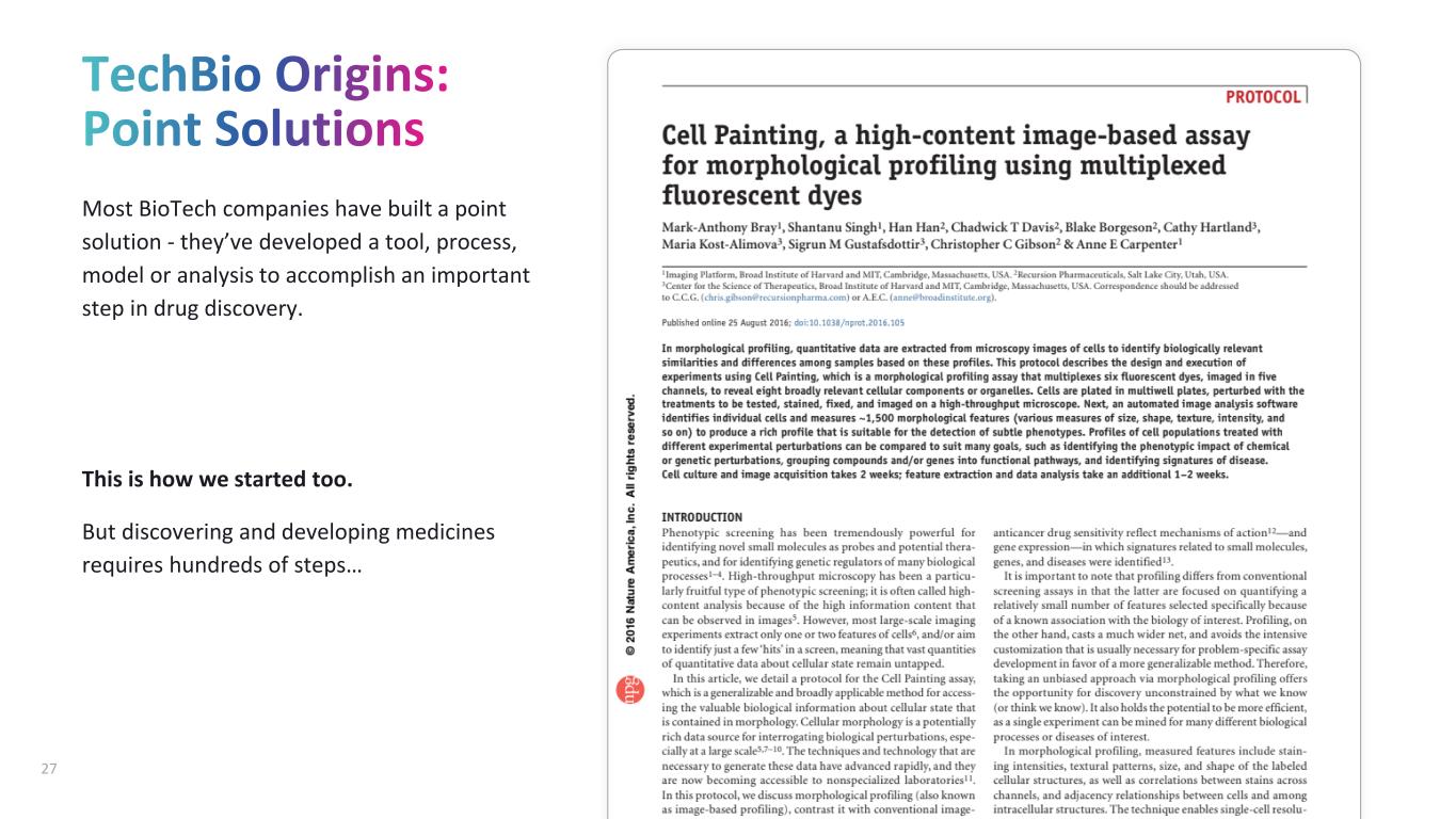 TechBio Origins: Point Solutions Most BioTech companies have built a point solution - they’ve developed a tool, process, model or analysis to accomplish an important step in drug discovery. This is how we started too. But discovering and developing medicines requires hundreds of steps… 27