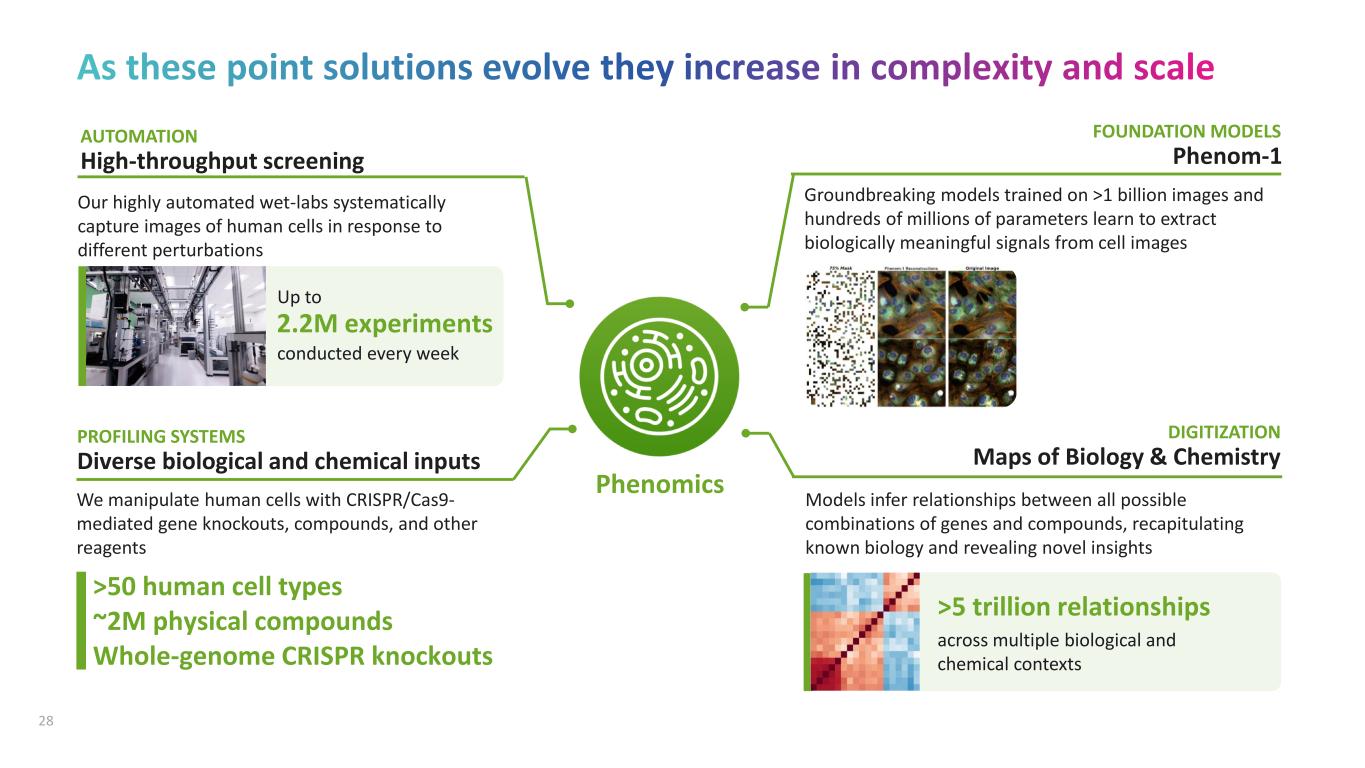 As these point solutions evolve they increase in complexity and scale We manipulate human cells with CRISPR/Cas9- mediated gene knockouts, compounds, and other reagents Phenom-1 Groundbreaking models trained on >1 billion images and hundreds of millions of parameters learn to extract biologically meaningful signals from cell images FOUNDATION MODELS Diverse biological and chemical inputs PROFILING SYSTEMS Our highly automated wet-labs systematically capture images of human cells in response to different perturbations High-throughput screening AUTOMATION Maps of Biology & Chemistry DIGITIZATION >50 human cell types ~2M physical compounds Whole-genome CRISPR knockouts Models infer relationships between all possible combinations of genes and compounds, recapitulating known biology and revealing novel insights across multiple biological and chemical contexts >5 trillion relationships conducted every week 2.2M experiments Phenomics Up to 28