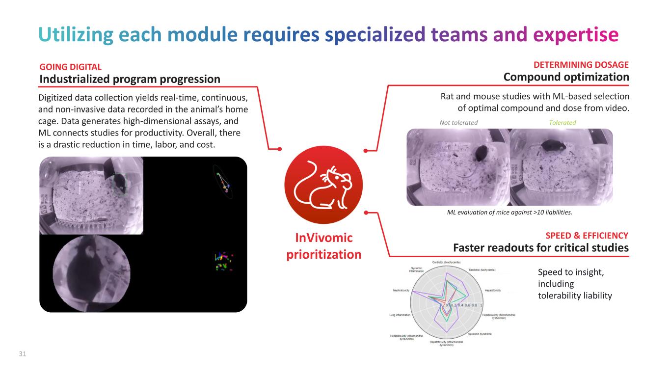 Each module is complex, and we continuously improve them Prioritize compound synthesis for compounds predicted to have high likelihood of suitable pharmacokinetics DMPK In Vivo Validation Establish in vitro-in vivo and in silico-in vivo correlations to minimize experimental toil. ANIMAL PHARMACOKINETICSPre-synthesis Evaluation ENRICH FOR QUALITY A highly automated DMPK module executes 3 critical assays across human and rat contexts. HT ADME Experiments WET LAB Leverage Recursion’s power for structure-based prediction of in vitro assays and in vivo compound profiles Predictive Models LEARNING CYCLES 30