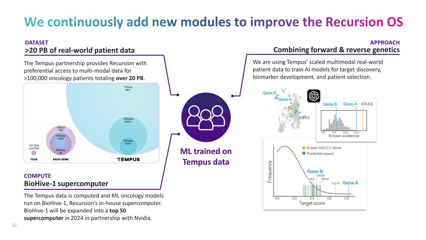 We continuously add new modules to improve the Recursion OS The Tempus data is computed and ML oncology models run on BioHive-1, Recursion’s in-house supercomputer. BioHive-1 will be expanded into a top 50 supercomputer in 2024 in partnership with Nvidia. ML trained on Tempus data BioHive-1 supercomputer COMPUTE The Tempus partnership provides Recursion with preferential access to multi-modal data for >100,000 oncology patients totaling over 20 PB. >20 PB of real-world patient data DATASET We are using Tempus’ scaled multimodal real-world patient data to train AI models for target discovery, biomarker development, and patient selection. Combining forward & reverse genetics APPROACH 32