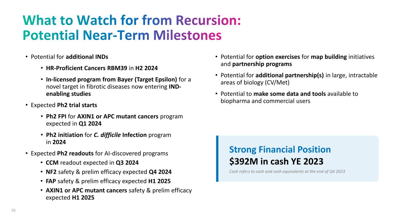 • Potential for additional INDs • HR-Proficient Cancers RBM39 in H2 2024 • In-licensed program from Bayer (Target Epsilon) for a novel target in fibrotic diseases now entering IND- enabling studies • Expected Ph2 trial starts • Ph2 FPI for AXIN1 or APC mutant cancers program expected in Q1 2024 • Ph2 initiation for C. difficile Infection program in 2024 • Expected Ph2 readouts for AI-discovered programs • CCM readout expected in Q3 2024 • NF2 safety & prelim efficacy expected Q4 2024 • FAP safety & prelim efficacy expected H1 2025 • AXIN1 or APC mutant cancers safety & prelim efficacy expected H1 2025 What to Watch for from Recursion: Potential Near-Term Milestones • Potential for option exercises for map building initiatives and partnership programs • Potential for additional partnership(s) in large, intractable areas of biology (CV/Met) • Potential to make some data and tools available to biopharma and commercial users Strong Financial Position $392M in cash YE 2023 Cash refers to cash and cash equivalents at the end of Q4 2023 36