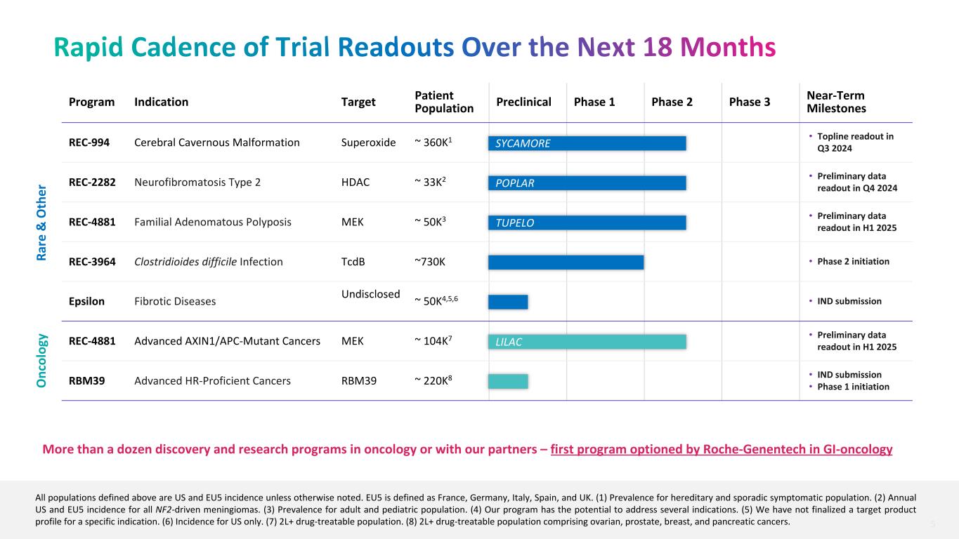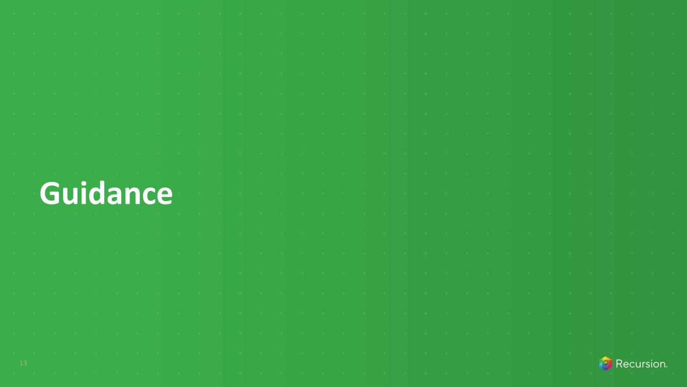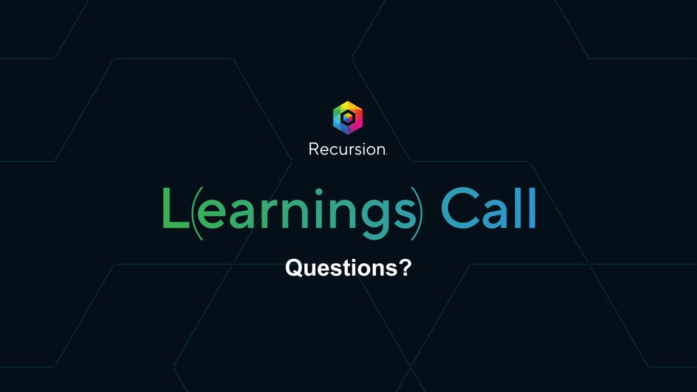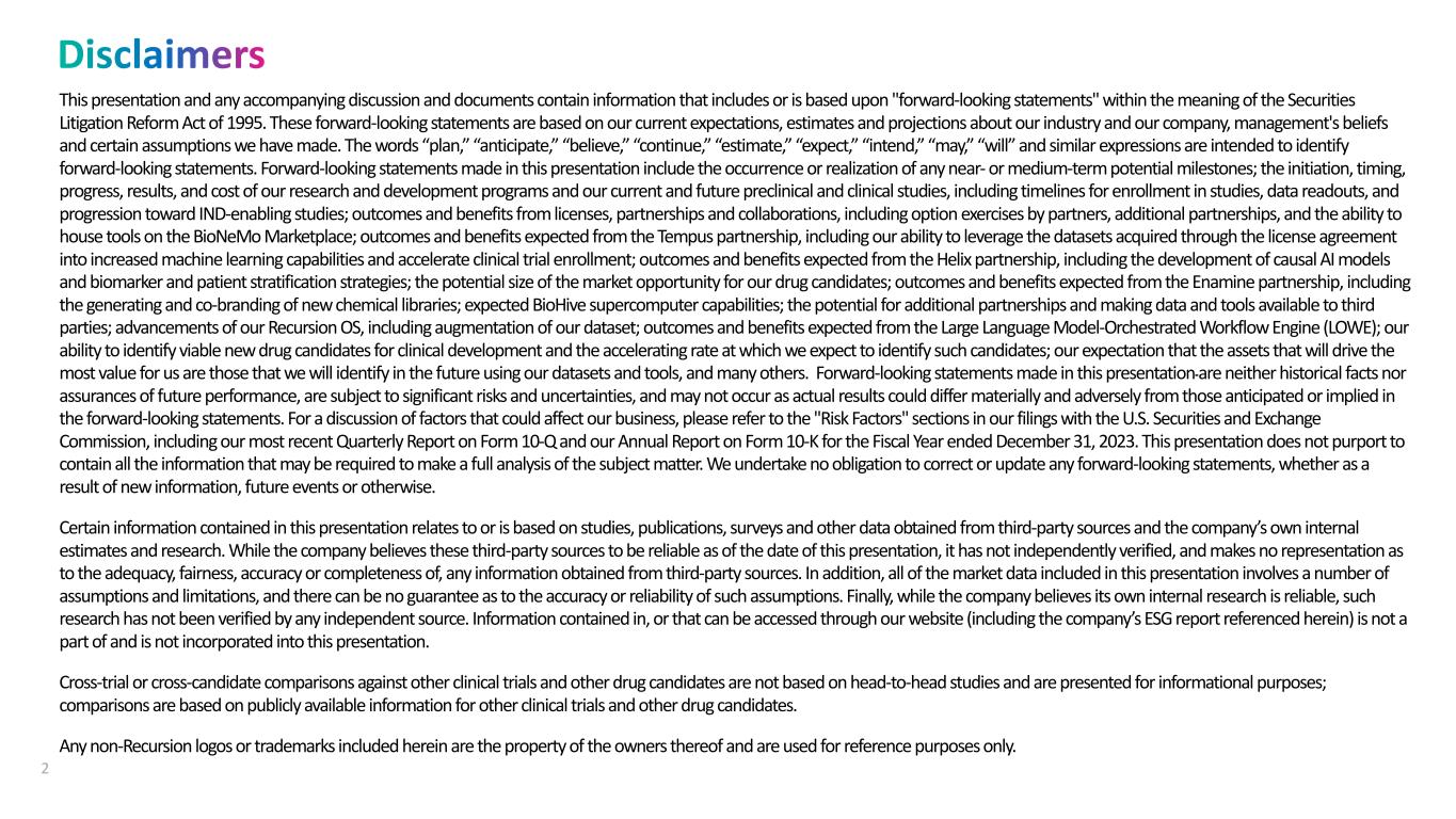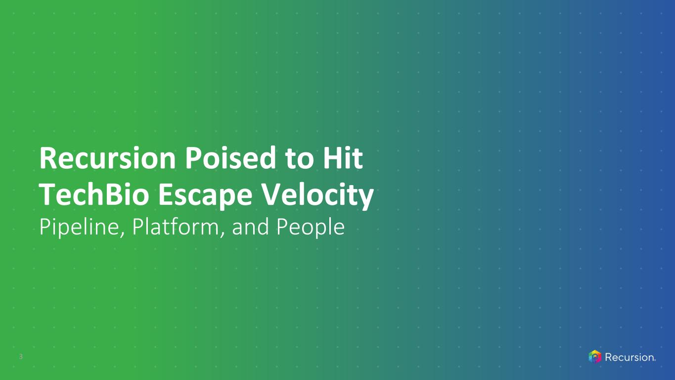 This presentation and any accompanying discussion and documents contain information that includes or is based upon "forward-looking statements" within the meaning of the Securities Litigation Reform Act of 1995. These forward-looking statements are based on our current expectations, estimates and projections about our industry and our company, management's beliefs and certain assumptions we have made. The words “plan,” “anticipate,” “believe,” “continue,” “estimate,” “expect,” “intend,” “may,” “will” and similar expressions are intended to identify forward-looking statements. Forward-looking statements made in this presentation include the occurrence or realization of any near- or medium-term potential milestones; the initiation, timing, progress, results, and cost of our research and development programs and our current and future preclinical and clinical studies, including timelines for enrollment in studies, data readouts, and progression toward IND-enabling studies; outcomes and benefits from licenses, partnerships and collaborations, including option exercises by partners, additional partnerships, and the ability to house tools on the BioNeMo Marketplace; outcomes and benefits expected from the Tempus partnership, including our ability to leverage the datasets acquired through the license agreement into increased machine learning capabilities and accelerate clinical trial enrollment; outcomes and benefits expected from the Helix partnership, including the development of causal AI models and biomarker and patient stratification strategies; the potential size of the market opportunity for our drug candidates; outcomes and benefits expected from the Enamine partnership, including the generating and co-branding of new chemical libraries; expected BioHive supercomputer capabilities; the potential for additional partnerships and making data and tools available to third parties; advancements of our Recursion OS, including augmentation of our dataset; outcomes and benefits expected from the Large Language Model-Orchestrated Workflow Engine (LOWE); our ability to identify viable new drug candidates for clinical development and the accelerating rate at which we expect to identify such candidates; our expectation that the assets that will drive the most value for us are those that we will identify in the future using our datasets and tools, and many others. Forward-looking statements made in this presentation are neither historical facts nor assurances of future performance, are subject to significant risks and uncertainties, and may not occur as actual results could differ materially and adversely from those anticipated or implied in the forward-looking statements. For a discussion of factors that could affect our business, please refer to the "Risk Factors" sections in our filings with the U.S. Securities and Exchange Commission, including our most recent Quarterly Report on Form 10-Q and our Annual Report on Form 10-K for the Fiscal Year ended December 31, 2023. This presentation does not purport to contain all the information that may be required to make a full analysis of the subject matter. We undertake no obligation to correct or update any forward-looking statements, whether as a result of new information, future events or otherwise. Certain information contained in this presentation relates to or is based on studies, publications, surveys and other data obtained from third-party sources and the company’s own internal estimates and research. While the company believes these third-party sources to be reliable as of the date of this presentation, it has not independently verified, and makes no representation as to the adequacy, fairness, accuracy or completeness of, any information obtained from third-party sources. In addition, all of the market data included in this presentation involves a number of assumptions and limitations, and there can be no guarantee as to the accuracy or reliability of such assumptions. Finally, while the company believes its own internal research is reliable, such research has not been verified by any independent source. Information contained in, or that can be accessed through our website (including the company’s ESG report referenced herein) is not a part of and is not incorporated into this presentation. Cross-trial or cross-candidate comparisons against other clinical trials and other drug candidates are not based on head-to-head studies and are presented for informational purposes; comparisons are based on publicly available information for other clinical trials and other drug candidates. Any non-Recursion logos or trademarks included herein are the property of the owners thereof and are used for reference purposes only. 2