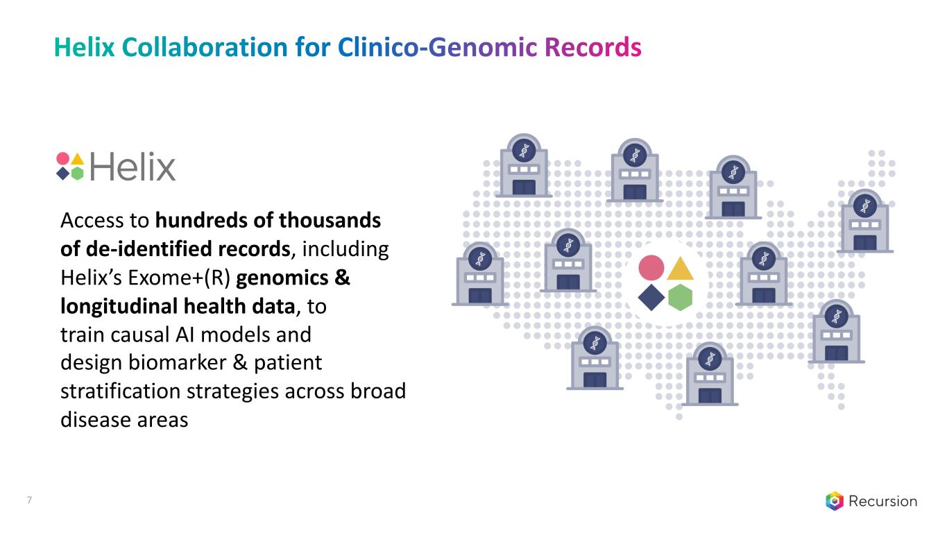 7 Access to hundreds of thousands of de-identified records, including Helix’s Exome+(R) genomics & longitudinal health data, to train causal AI models and design biomarker & patient stratification strategies across broad disease areas