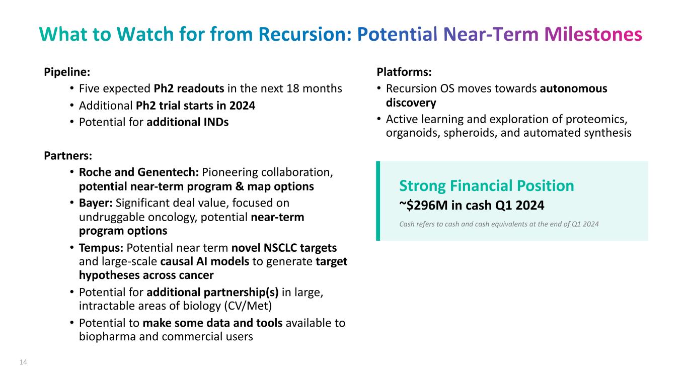 Pipeline: • Five expected Ph2 readouts in the next 18 months • Additional Ph2 trial starts in 2024 • Potential for additional INDs Partners: • Roche and Genentech: Pioneering collaboration, potential near-term program & map options • Bayer: Significant deal value, focused on undruggable oncology, potential near-term program options • Tempus: Potential near term novel NSCLC targets and large-scale causal AI models to generate target hypotheses across cancer • Potential for additional partnership(s) in large, intractable areas of biology (CV/Met) • Potential to make some data and tools available to biopharma and commercial users Platforms: • Recursion OS moves towards autonomous discovery • Active learning and exploration of proteomics, organoids, spheroids, and automated synthesis Strong Financial Position ~$296M in cash Q1 2024 Cash refers to cash and cash equivalents at the end of Q1 2024 14