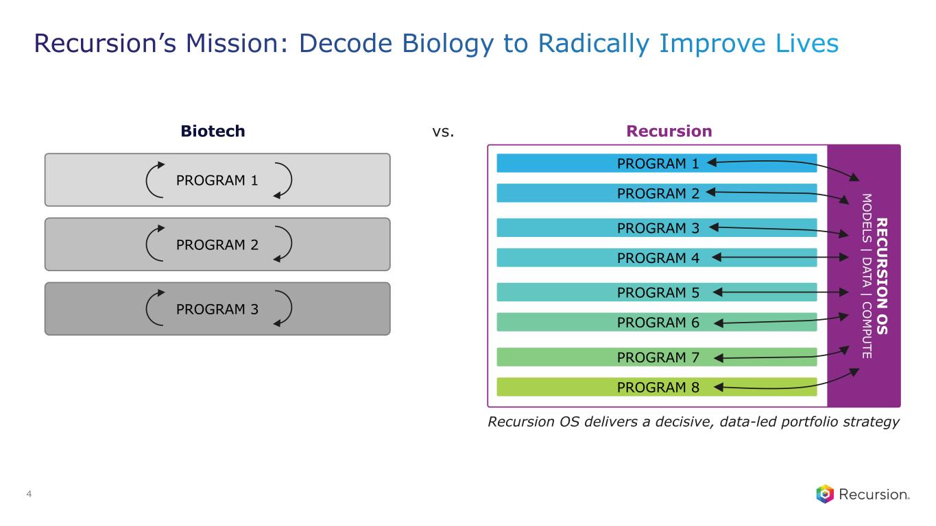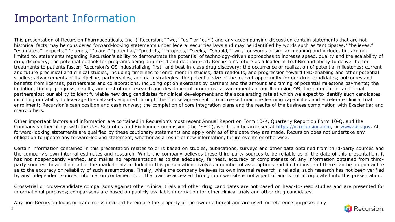 This presentation of Recursion Pharmaceuticals, Inc. (“Recursion,” “we,” “us,” or “our”) and any accompanying discussion contain statements that are not historical facts may be considered forward-looking statements under federal securities laws and may be identified by words such as “anticipates,” “believes,” “estimates,” “expects,” “intends,” “plans,” “potential,” “predicts,” “projects,” “seeks,” “should,” “will,” or words of similar meaning and include, but are not limited to, statements regarding Recursion’s ability to demonstrate the potential of technology-driven approaches to increase speed, quality and the scalability of drug discovery; the potential outlook for programs being prioritized and deprioritized; Recursion's future as a leader in TechBio and ability to deliver better treatments to patients faster; Recursion’s OS industrializing first- and best-in-class drug discovery; the occurrence or realization of potential milestones; current and future preclinical and clinical studies, including timelines for enrollment in studies, data readouts, and progression toward IND-enabling and other potential studies; advancements of its pipeline, partnerships, and data strategies; the potential size of the market opportunity for our drug candidates; outcomes and benefits from licenses, partnerships and collaborations, including option exercises by partners and the amount and timing of potential milestone payments; the initiation, timing, progress, results, and cost of our research and development programs; advancements of our Recursion OS; the potential for additional partnerships; our ability to identify viable new drug candidates for clinical development and the accelerating rate at which we expect to identify such candidates including our ability to leverage the datasets acquired through the license agreement into increased machine learning capabilities and accelerate clinical trial enrollment; Recursion’s cash position and cash runway; the completion of core integration plans and the results of the business combination with Exscientia; and many others. Other important factors and information are contained in Recursion’s most recent Annual Report on Form 10-K, Quarterly Report on Form 10-Q, and the Company’s other filings with the U.S. Securities and Exchange Commission (the “SEC”), which can be accessed at https://ir.recursion.com, or www.sec.gov. All forward-looking statements are qualified by these cautionary statements and apply only as of the date they are made. Recursion does not undertake any obligation to update any forward-looking statement, whether as a result of new information, future events or otherwise. Certain information contained in this presentation relates to or is based on studies, publications, surveys and other data obtained from third-party sources and the company’s own internal estimates and research. While the company believes these third-party sources to be reliable as of the date of this presentation, it has not independently verified, and makes no representation as to the adequacy, fairness, accuracy or completeness of, any information obtained from third- party sources. In addition, all of the market data included in this presentation involves a number of assumptions and limitations, and there can be no guarantee as to the accuracy or reliability of such assumptions. Finally, while the company believes its own internal research is reliable, such research has not been verified by any independent source. Information contained in, or that can be accessed through our website is not a part of and is not incorporated into this presentation. Cross-trial or cross-candidate comparisons against other clinical trials and other drug candidates are not based on head-to-head studies and are presented for informational purposes; comparisons are based on publicly available information for other clinical trials and other drug candidates. Any non-Recursion logos or trademarks included herein are the property of the owners thereof and are used for reference purposes only. 3
