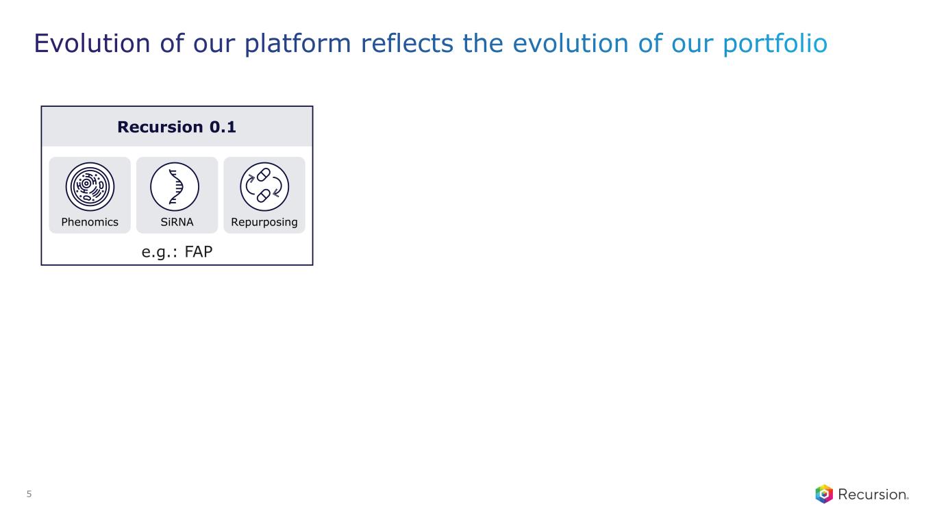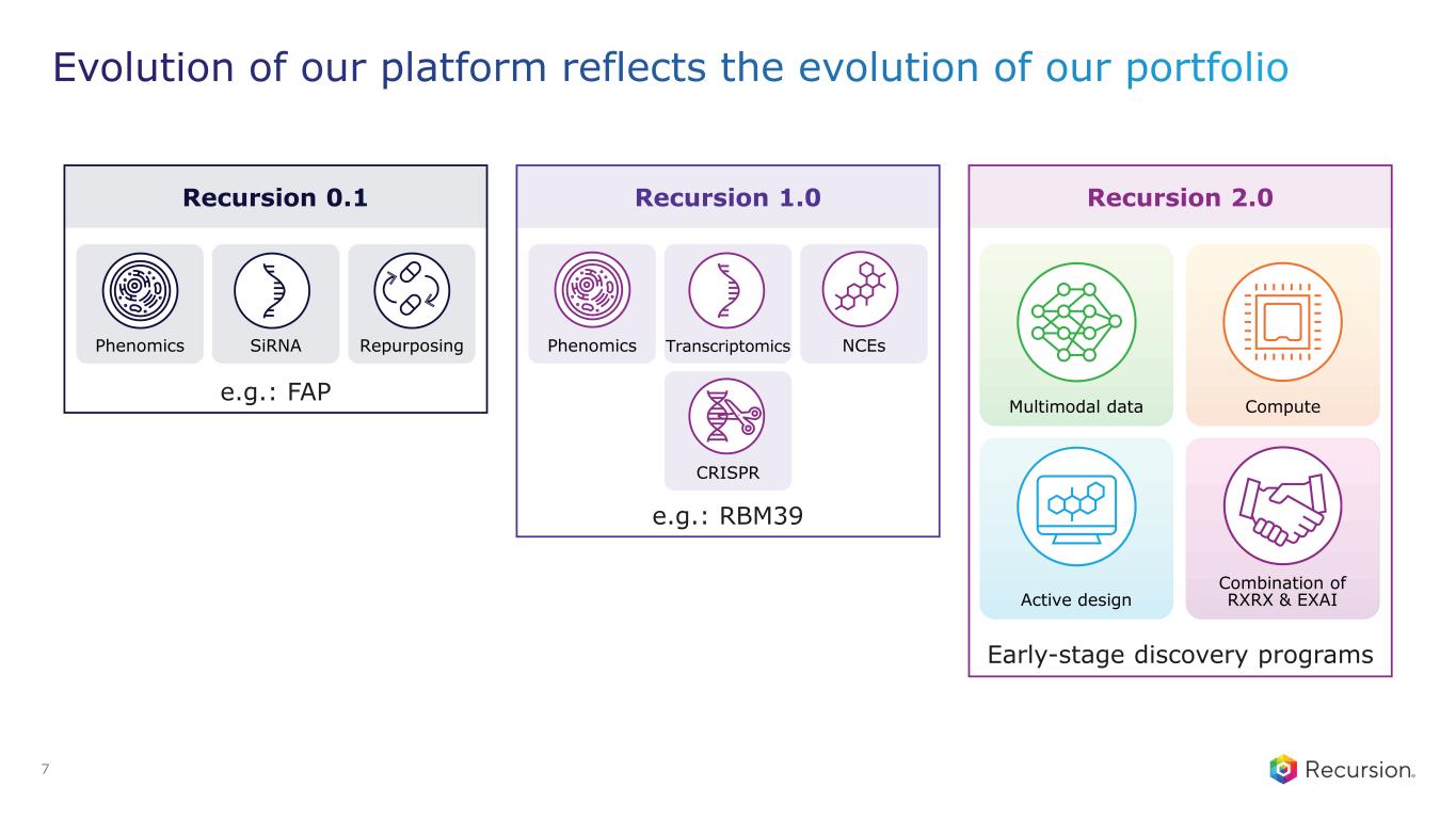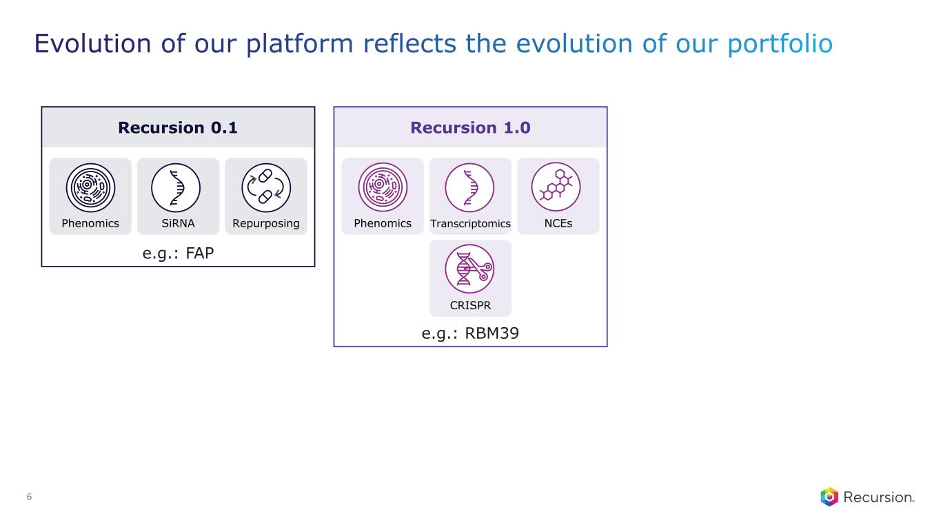 Recursion 0.1 e.g.: FAP Phenomics SiRNA Repurposing Recursion 1.0 e.g.: RBM39 Phenomics Transcriptomics NCEs CRISPR 6
