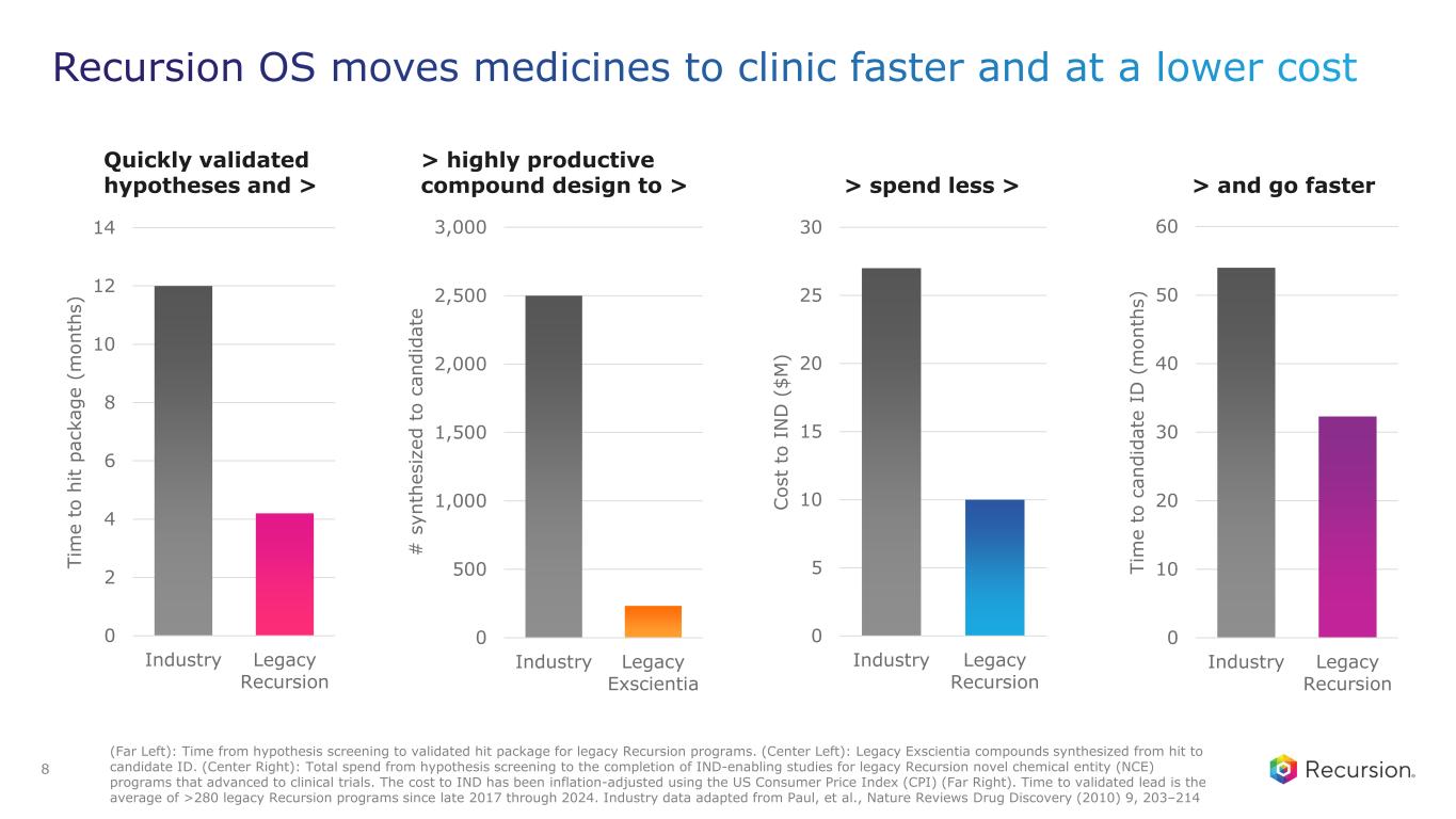 0 10 20 30 40 50 60 Industry Legacy Recursion Ti m e to c an di da te I D ( m on th s) > and go faster 0 5 10 15 20 25 30 Industry Legacy Recursion C os t to I N D ( $M ) > spend less > 0 500 1,000 1,500 2,000 2,500 3,000 Industry Legacy Exscientia > highly productive compound design to > # s yn th es iz ed t o ca nd id at e 0 2 4 6 8 10 12 14 Industry Legacy Recursion Ti m e to h it pa ck ag e (m on th s) Quickly validated hypotheses and > (Far Left): Time from hypothesis screening to validated hit package for legacy Recursion programs. (Center Left): Legacy Exscientia compounds synthesized from hit to candidate ID. (Center Right): Total spend from hypothesis screening to the completion of IND-enabling studies for legacy Recursion novel chemical entity (NCE) programs that advanced to clinical trials. The cost to IND has been inflation-adjusted using the US Consumer Price Index (CPI) (Far Right). Time to validated lead is the average of >280 legacy Recursion programs since late 2017 through 2024. Industry data adapted from Paul, et al., Nature Reviews Drug Discovery (2010) 9, 203–214 8