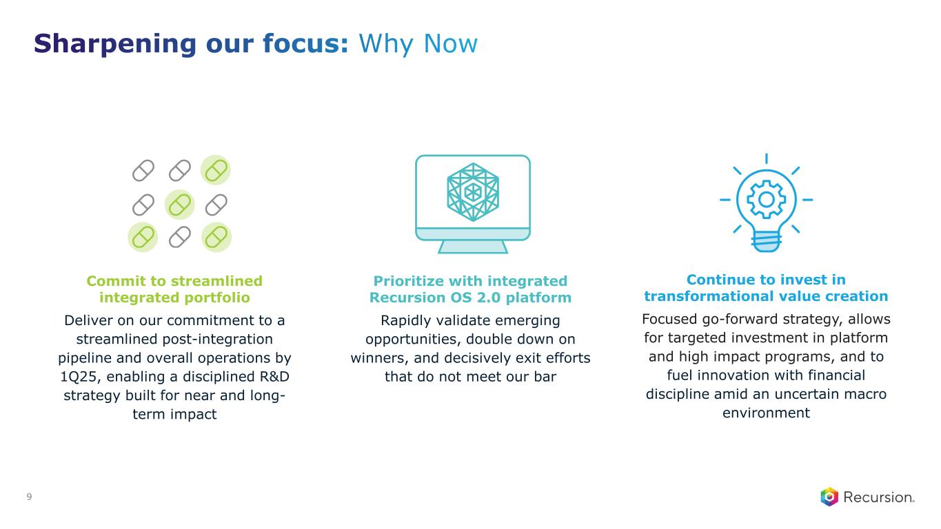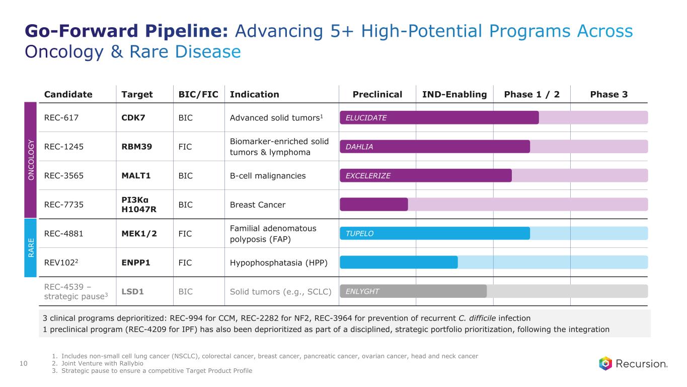 Commit to streamlined integrated portfolio Deliver on our commitment to a streamlined post-integration pipeline and overall operations by 1Q25, enabling a disciplined R&D strategy built for near and long- term impact Prioritize with integrated Recursion OS 2.0 platform Rapidly validate emerging opportunities, double down on winners, and decisively exit efforts that do not meet our bar Continue to invest in transformational value creation Focused go-forward strategy, allows for targeted investment in platform and high impact programs, and to fuel innovation with financial discipline amid an uncertain macro environment 9