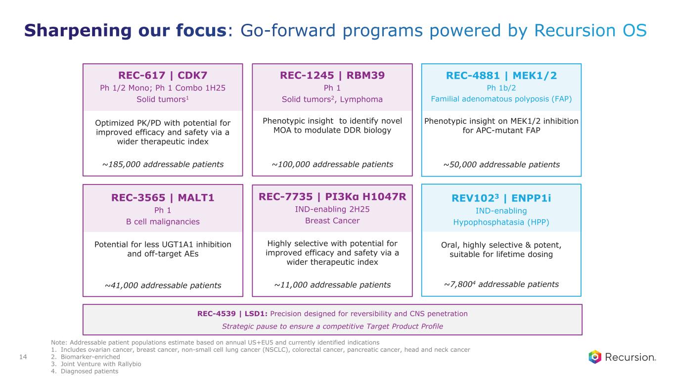 1. Includes non-small cell lung cancer (NSCLC), colorectal cancer, breast cancer, pancreatic cancer, ovarian cancer, head and neck cancer 2. Joint Venture with Rallybio 3. Strategic pause to ensure a competitive Target Product Profile 13 Candidate Target BIC/FIC Indication Preclinical IND-Enabling Phase 1 / 2 Phase 3 REC-617 CDK7 BIC Advanced solid tumors1 REC-1245 RBM39 FIC Biomarker-enriched solid tumors & lymphoma REC-3565 MALT1 BIC B-cell malignancies REC-7735 PI3Kα H1047R BIC Breast Cancer REC-4881 MEK1/2 FIC Familial adenomatous polyposis (FAP) REV1022 ENPP1 FIC Hypophosphatasia (HPP) REC-4539 – strategic pause3 LSD1 BIC Solid tumors (e.g., SCLC) ELUCIDATE TUPELO EXCELERIZE ENLYGHT DAHLIA R A R E O N C O LO G Y 3 clinical programs deprioritized: REC-994 for CCM, REC-2282 for NF2, REC-3964 for prevention of recurrent C. difficile infection 1 preclinical program (REC-4209 for IPF) has also been deprioritized as part of a disciplined, strategic portfolio prioritization, following the integration