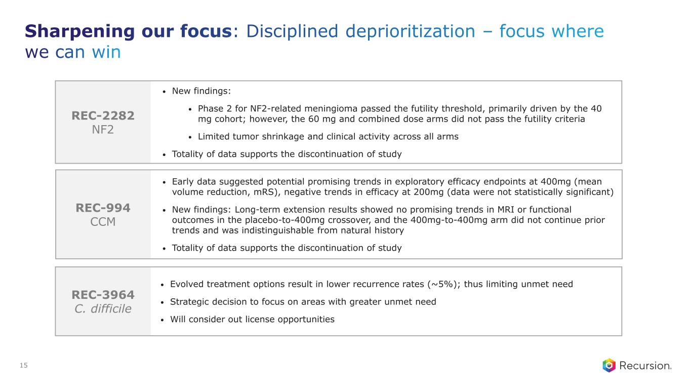 REC-617 | CDK7 Ph 1/2 Mono; Ph 1 Combo 1H25 Solid tumors1 Optimized PK/PD with potential for improved efficacy and safety via a wider therapeutic index ~185,000 addressable patients REC-1245 | RBM39 Ph 1 Solid tumors2, Lymphoma Phenotypic insight to identify novel MOA to modulate DDR biology ~100,000 addressable patients REC-3565 | MALT1 Ph 1 B cell malignancies Potential for less UGT1A1 inhibition and off-target AEs ~41,000 addressable patients REC-7735 | PI3Kα H1047R IND-enabling 2H25 Breast Cancer Highly selective with potential for improved efficacy and safety via a wider therapeutic index ~11,000 addressable patients REV1023 | ENPP1i IND-enabling Hypophosphatasia (HPP) Oral, highly selective & potent, suitable for lifetime dosing ~7,8004 addressable patients REC-4881 | MEK1/2 Ph 1b/2 Familial adenomatous polyposis (FAP) Phenotypic insight on MEK1/2 inhibition for APC-mutant FAP ~50,000 addressable patients REC-4539 | LSD1: Precision designed for reversibility and CNS penetration Strategic pause to ensure a competitive Target Product Profile Note: Addressable patient populations estimate based on annual US+EU5 and currently identified indications 1. Includes ovarian cancer, breast cancer, non-small cell lung cancer (NSCLC), colorectal cancer, pancreatic cancer, head and neck cancer 2. Biomarker-enriched 3. Joint Venture with Rallybio 4. Diagnosed patients 14