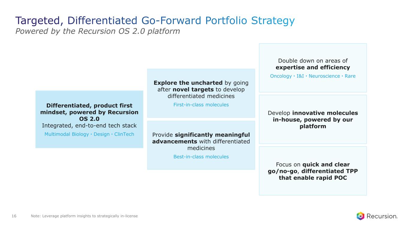 Powered by the Recursion OS 2.0 platform Explore the uncharted by going after novel targets to develop differentiated medicines First-in-class molecules Provide significantly meaningful advancements with differentiated medicines Best-in-class molecules Differentiated, product first mindset, powered by Recursion OS 2.0 Integrated, end-to-end tech stack Multimodal Biology・Design・ClinTech Focus on quick and clear go/no-go, differentiated TPP that enable rapid POC Double down on areas of expertise and efficiency Oncology・I&I・Neuroscience・Rare Develop innovative molecules in-house, powered by our platform Note: Leverage platform insights to strategically in-license16