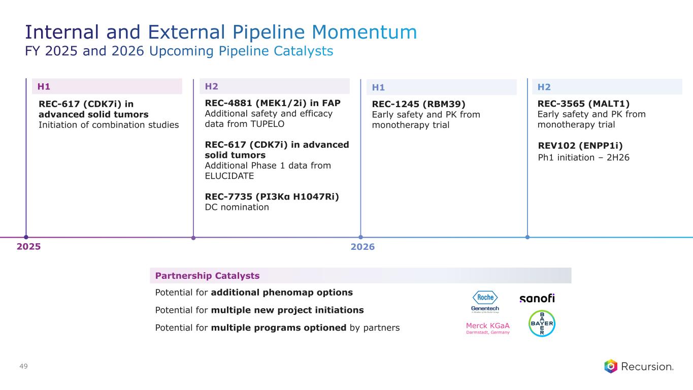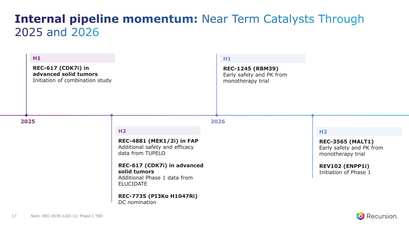 2025 2026 H1 REC-617 (CDK7i) in advanced solid tumors Initiation of combination study H2 REC-4881 (MEK1/2i) in FAP Additional safety and efficacy data from TUPELO REC-617 (CDK7i) in advanced solid tumors Additional Phase 1 data from ELUCIDATE REC-7735 (PI3Kα H1047Ri) DC nomination H1 REC-1245 (RBM39) Early safety and PK from monotherapy trial H2 REC-3565 (MALT1) Early safety and PK from monotherapy trial REV102 (ENPP1i) Initiation of Phase 1 Note: REC-4539 (LSD-1i), Phase 1 TBD17