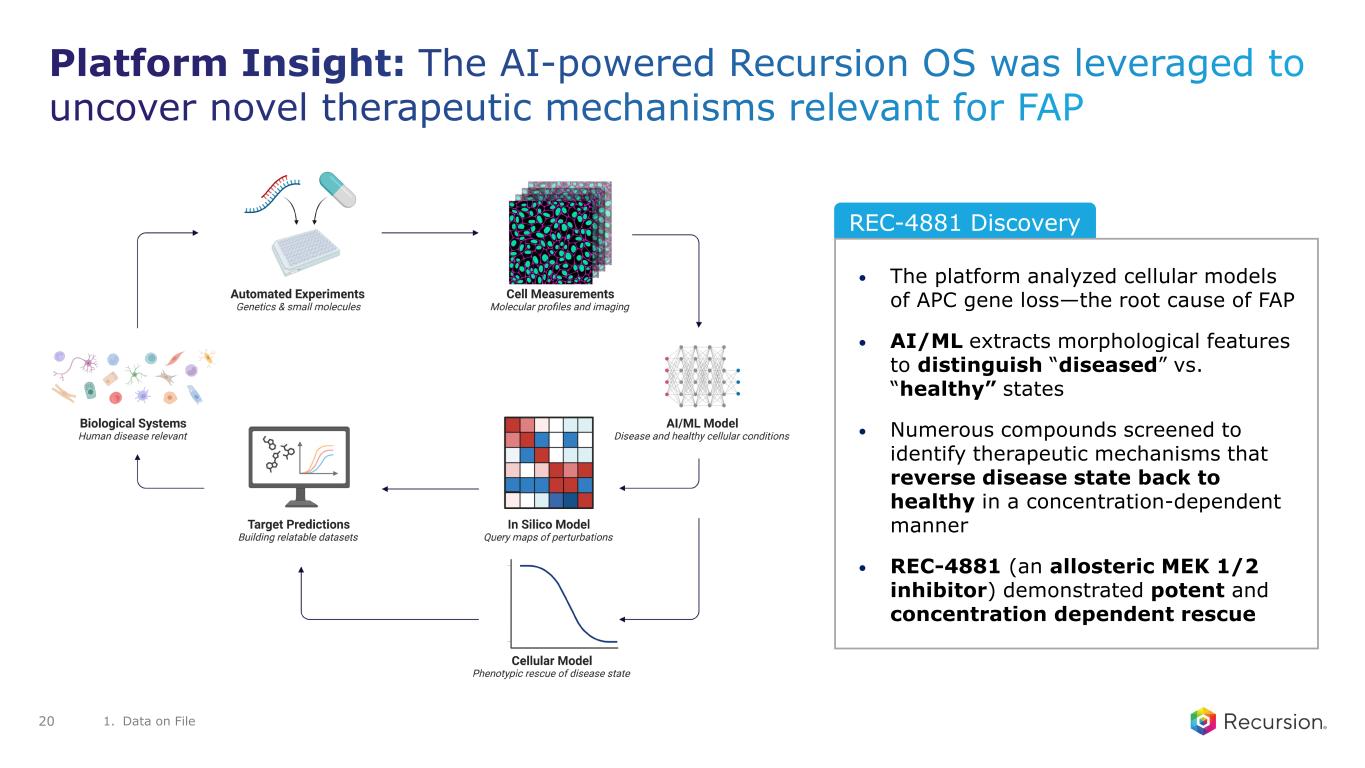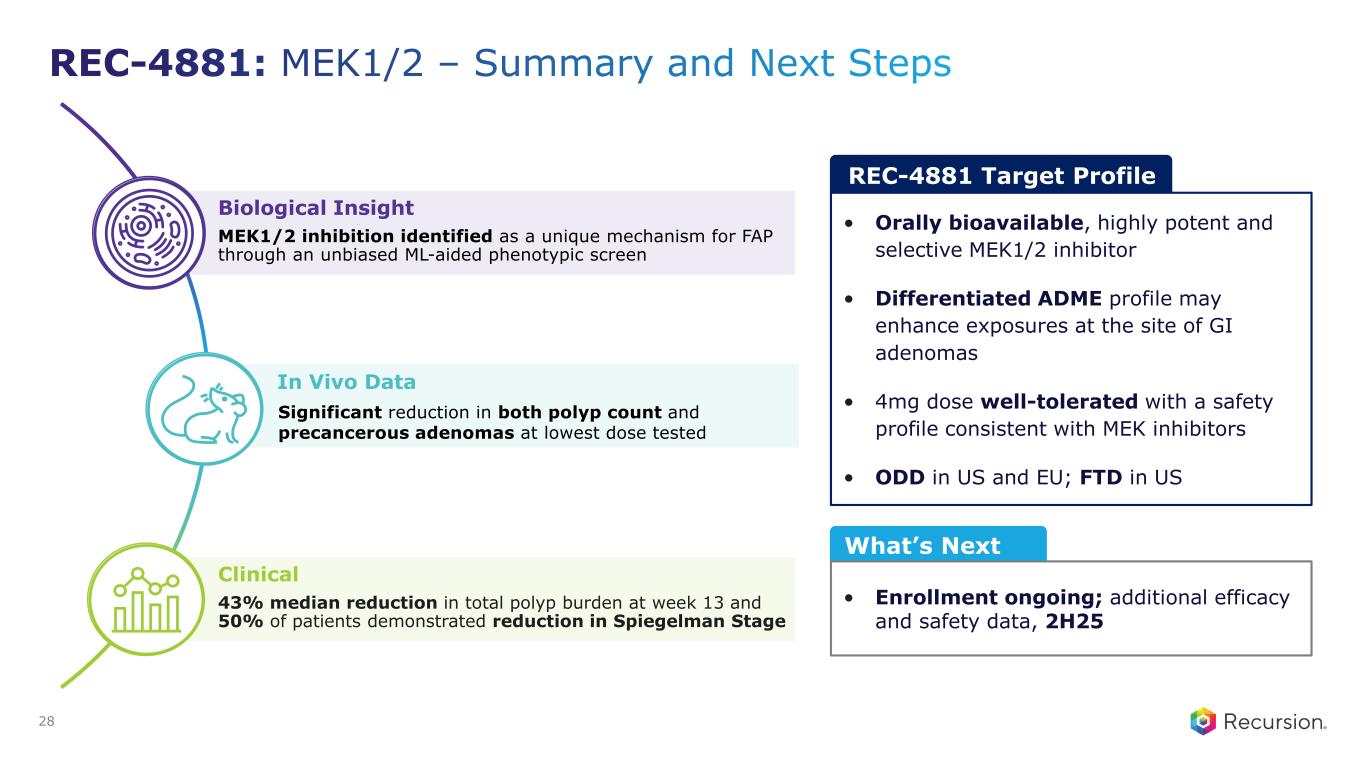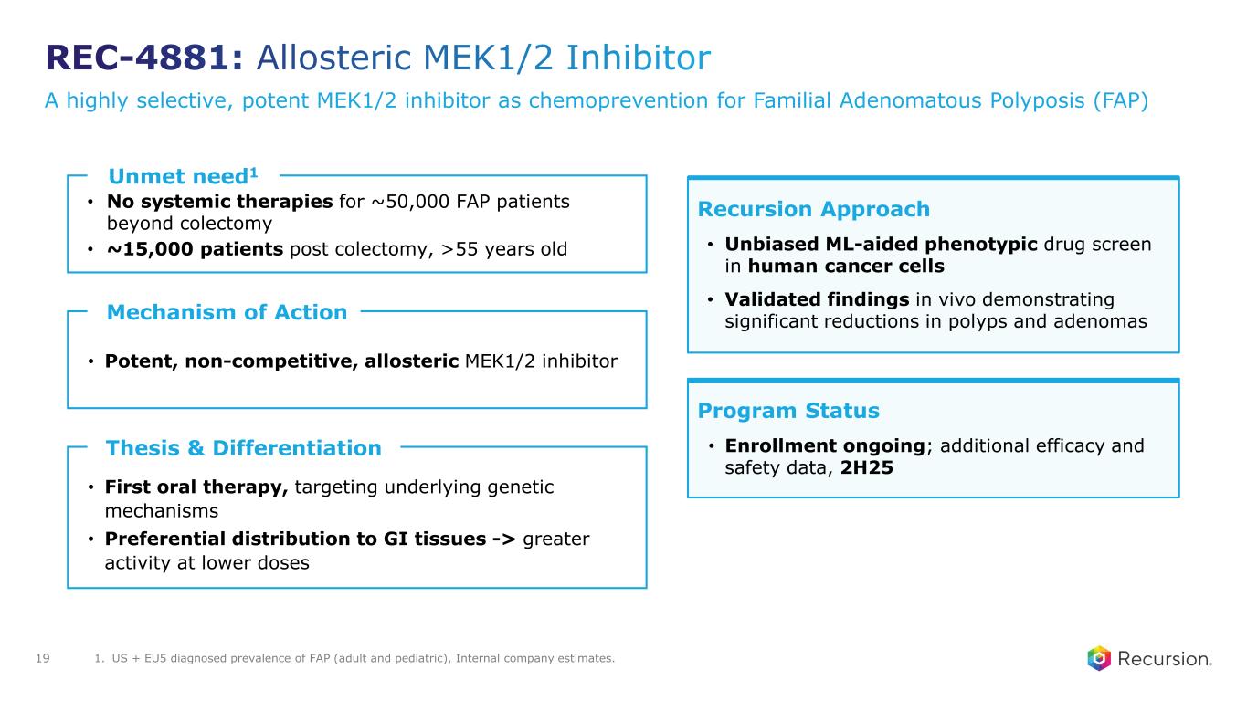 A highly selective, potent MEK1/2 inhibitor as chemoprevention for Familial Adenomatous Polyposis (FAP) Unmet need1 • No systemic therapies for ~50,000 FAP patients beyond colectomy • ~15,000 patients post colectomy, >55 years old Thesis & Differentiation • First oral therapy, targeting underlying genetic mechanisms • Preferential distribution to GI tissues -> greater activity at lower doses Recursion Approach • Unbiased ML-aided phenotypic drug screen in human cancer cells • Validated findings in vivo demonstrating significant reductions in polyps and adenomas Program Status • Enrollment ongoing; additional efficacy and safety data, 2H25 Mechanism of Action • Potent, non-competitive, allosteric MEK1/2 inhibitor 1. US + EU5 diagnosed prevalence of FAP (adult and pediatric), Internal company estimates.19