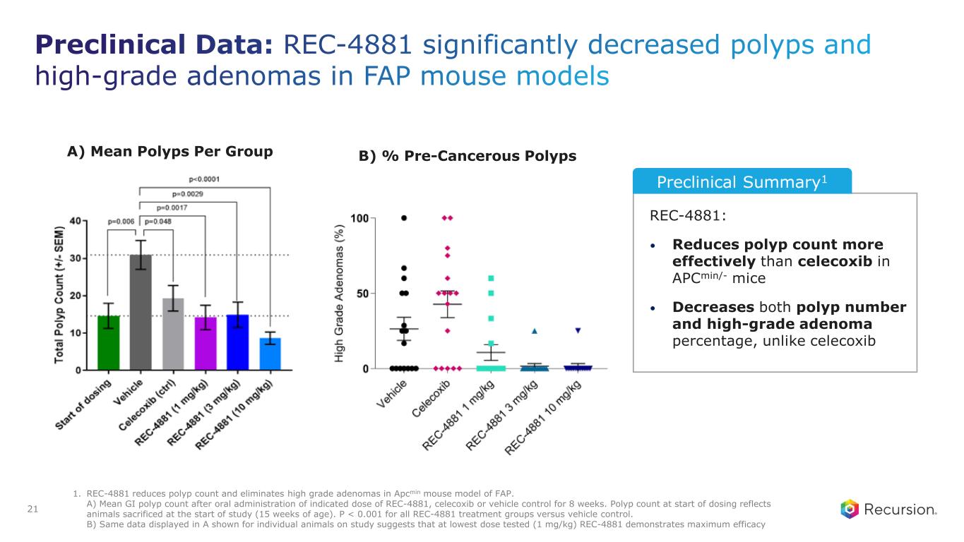 REC-4881 Discovery • The platform analyzed cellular models of APC gene loss—the root cause of FAP • AI/ML extracts morphological features to distinguish “diseased” vs. “healthy” states • Numerous compounds screened to identify therapeutic mechanisms that reverse disease state back to healthy in a concentration-dependent manner • REC-4881 (an allosteric MEK 1/2 inhibitor) demonstrated potent and concentration dependent rescue 1. Data on File 20