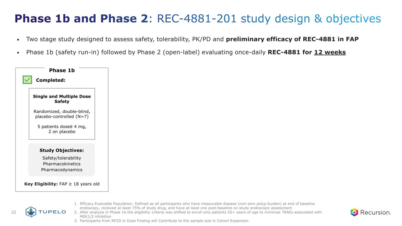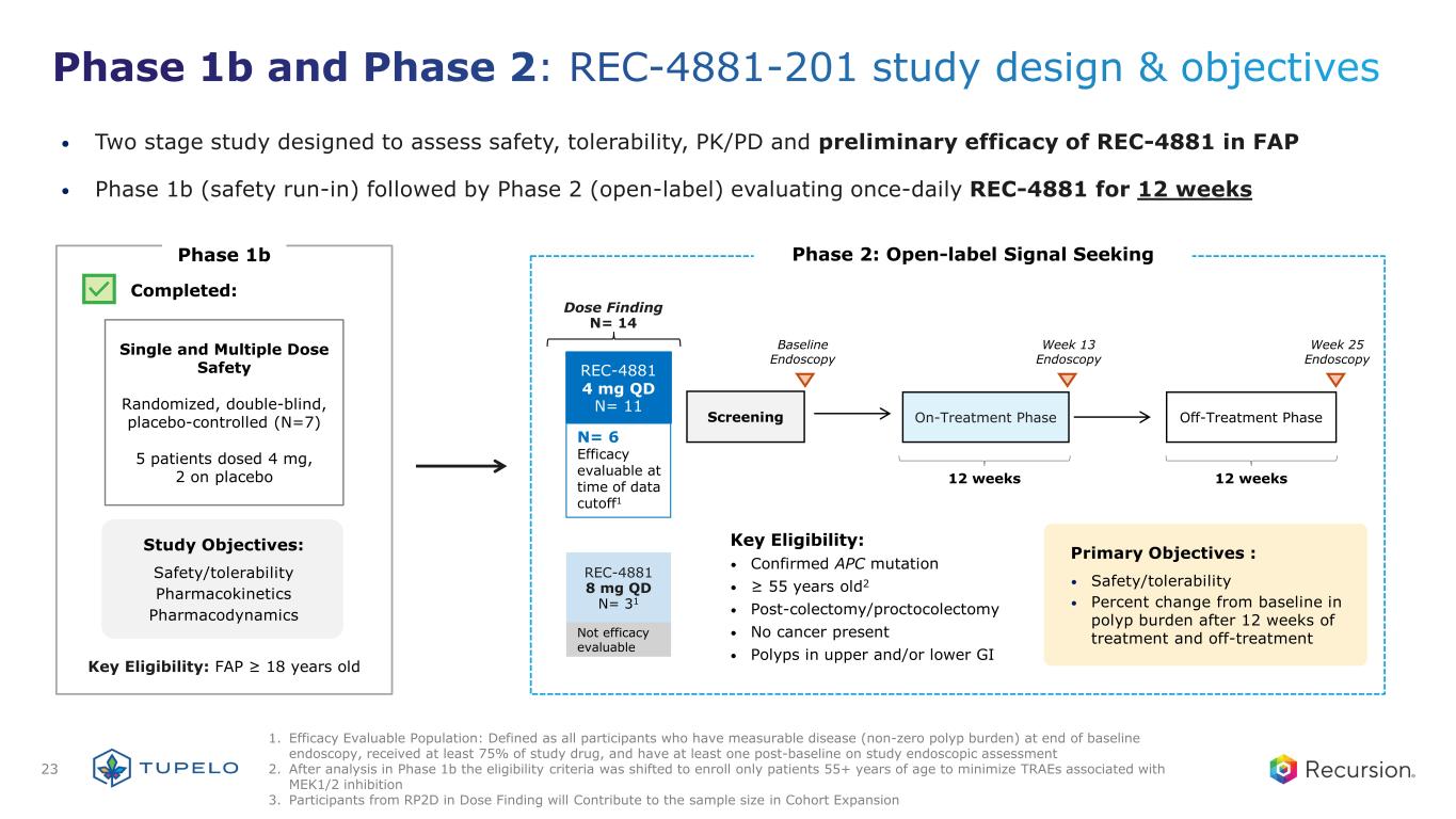 • Two stage study designed to assess safety, tolerability, PK/PD and preliminary efficacy of REC-4881 in FAP • Phase 1b (safety run-in) followed by Phase 2 (open-label) evaluating once-daily REC-4881 for 12 weeks Phase 1b Study Objectives: Safety/tolerability Pharmacokinetics Pharmacodynamics Single and Multiple Dose Safety Randomized, double-blind, placebo-controlled (N=7) 5 patients dosed 4 mg, 2 on placebo Completed: Key Eligibility: FAP ≥ 18 years old 1. Efficacy Evaluable Population: Defined as all participants who have measurable disease (non-zero polyp burden) at end of baseline endoscopy, received at least 75% of study drug, and have at least one post-baseline on study endoscopic assessment 2. After analysis in Phase 1b the eligibility criteria was shifted to enroll only patients 55+ years of age to minimize TRAEs associated with MEK1/2 inhibition 3. Participants from RP2D in Dose Finding will Contribute to the sample size in Cohort Expansion 22