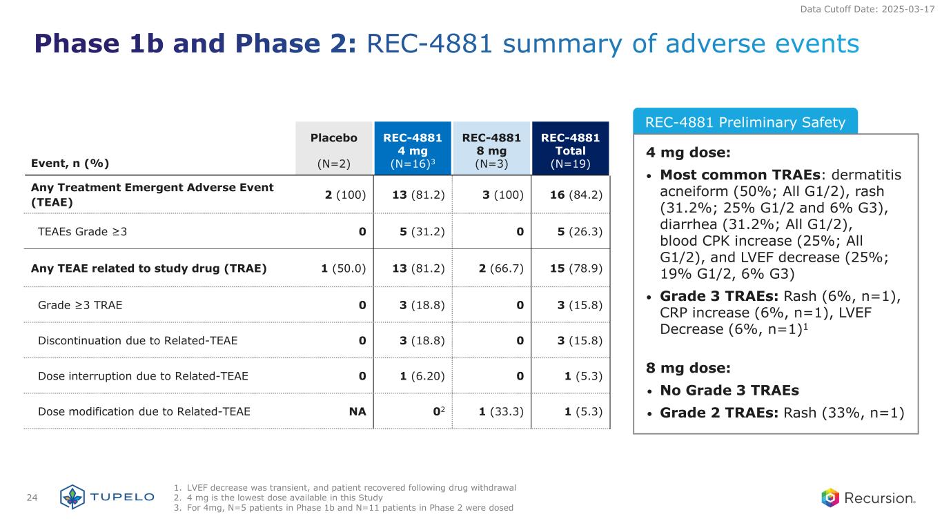 REC-4881 Preliminary Safety Event, n (%) Placebo (N=2) REC-4881 4 mg (N=16)3 REC-4881 8 mg (N=3) REC-4881 Total (N=19) Any Treatment Emergent Adverse Event (TEAE) 2 (100) 13 (81.2) 3 (100) 16 (84.2) TEAEs Grade ≥3 0 5 (31.2) 0 5 (26.3) Any TEAE related to study drug (TRAE) 1 (50.0) 13 (81.2) 2 (66.7) 15 (78.9) Grade ≥3 TRAE 0 3 (18.8) 0 3 (15.8) Discontinuation due to Related-TEAE 0 3 (18.8) 0 3 (15.8) Dose interruption due to Related-TEAE 0 1 (6.20) 0 1 (5.3) Dose modification due to Related-TEAE NA 02 1 (33.3) 1 (5.3) 4 mg dose: • Most common TRAEs: dermatitis acneiform (50%; All G1/2), rash (31.2%; 25% G1/2 and 6% G3), diarrhea (31.2%; All G1/2), blood CPK increase (25%; All G1/2), and LVEF decrease (25%; 19% G1/2, 6% G3) • Grade 3 TRAEs: Rash (6%, n=1), CRP increase (6%, n=1), LVEF Decrease (6%, n=1)1 8 mg dose: • No Grade 3 TRAEs • Grade 2 TRAEs: Rash (33%, n=1) Data Cutoff Date: 2025-03-17 24 1. LVEF decrease was transient, and patient recovered following drug withdrawal 2. 4 mg is the lowest dose available in this Study 3. For 4mg, N=5 patients in Phase 1b and N=11 patients in Phase 2 were dosed