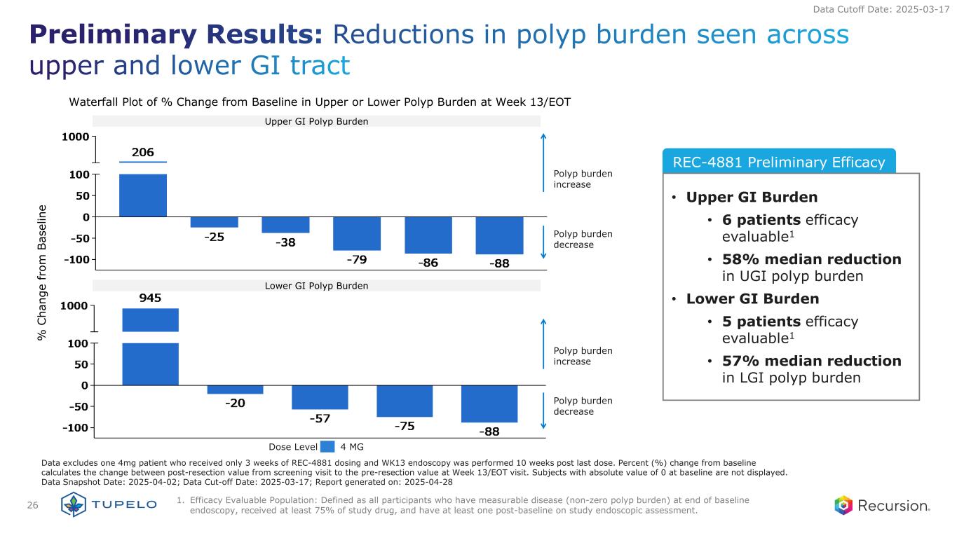 • 6 patients on 4 mg efficacy evaluable1 • 100% (n=6) on therapy for at least 9 weeks • 43% median reduction in total polyp burden • > 30% reduction in total polyp burden (sum of polyp diameters) at week 13 assessment • At week 25, 2 out of 2 patients on the 12-week on/12- week off regimen maintained a durable >30% reduction2 Data Cutoff Date: 2025-03-17 Polyp burden increase (17% non responders) Polyp burden decrease (83% responders) 12 Weeks 9 Weeks 10 Weeks 12 Weeks 12 Weeks 12 Weeks Data excludes one 4mg patient who received only 3 weeks of REC-4881 dosing and WK13 endoscopy was performed 10 weeks post last dose. Percent (%) change from baseline calculates the change between post- resection value from screening visit to the pre-resection value at Week 13/EOT visit. Subjects with absolute value of 0 at baseline are not displayed. Data Snapshot Date: 2025-04-02; Data Cut-off Date: 2025-03-17; Report generated on: 2025-04-28 Dose Level 4 MG REC-4881 Preliminary Efficacy 25 1. Efficacy Evaluable Population: Defined as all participants who have measurable disease (non-zero polyp burden) at end of baseline endoscopy, received at least 75% of study drug, and have at least one post-baseline on study endoscopic assessment. 2. A third patient, Patient 001-2001, who reached W25, did not perform W25 Assessment