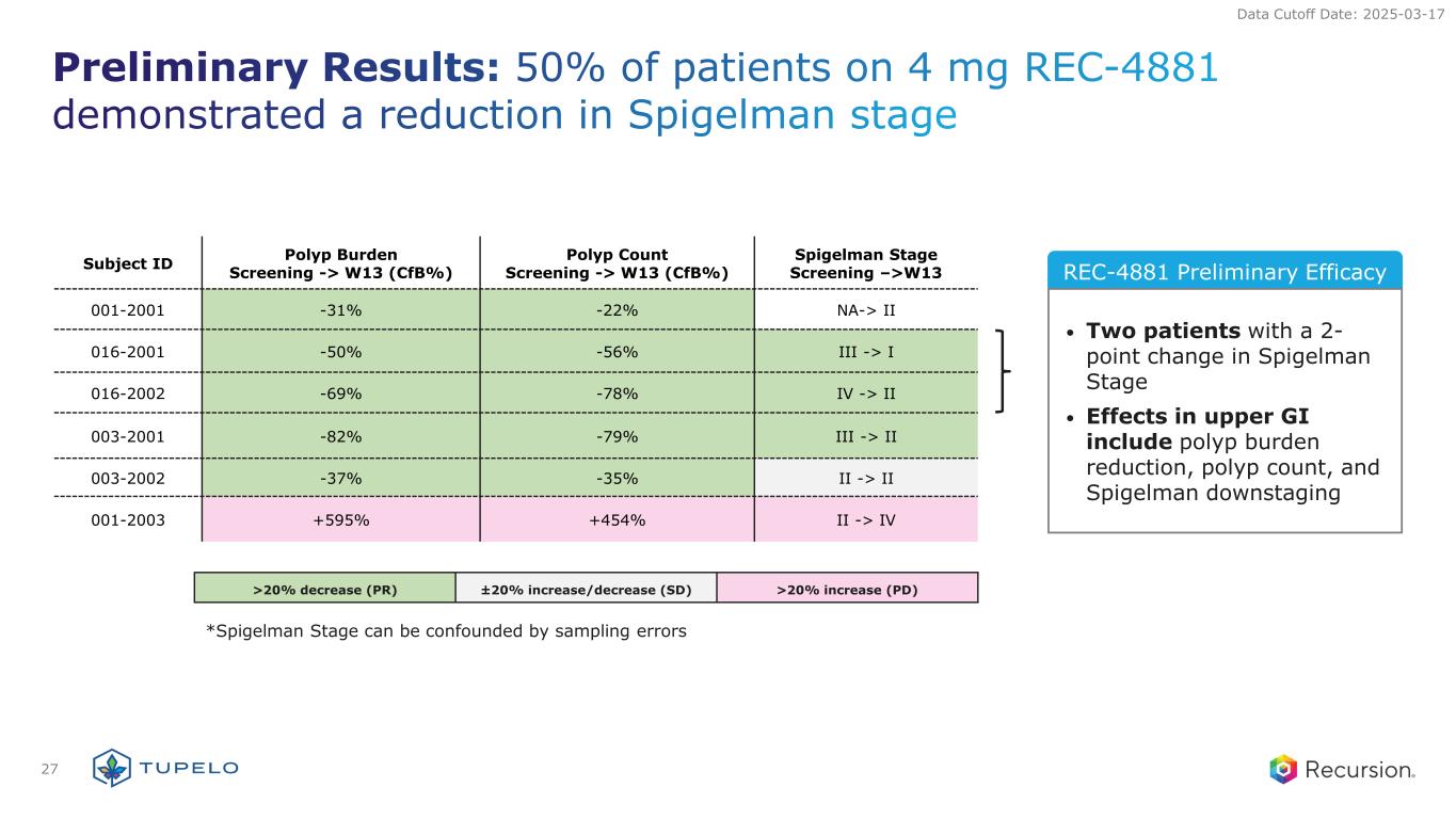 REC-4881 Preliminary Efficacy • Upper GI Burden • 6 patients efficacy evaluable1 • 58% median reduction in UGI polyp burden • Lower GI Burden • 5 patients efficacy evaluable1 • 57% median reduction in LGI polyp burden Data Cutoff Date: 2025-03-17 Upper GI Polyp Burden Lower GI Polyp Burden Waterfall Plot of % Change from Baseline in Upper or Lower Polyp Burden at Week 13/EOT Polyp burden increase Polyp burden decrease Polyp burden increase Polyp burden decrease % C ha ng e fr om B as el in e Data excludes one 4mg patient who received only 3 weeks of REC-4881 dosing and WK13 endoscopy was performed 10 weeks post last dose. Percent (%) change from baseline calculates the change between post-resection value from screening visit to the pre-resection value at Week 13/EOT visit. Subjects with absolute value of 0 at baseline are not displayed. Data Snapshot Date: 2025-04-02; Data Cut-off Date: 2025-03-17; Report generated on: 2025-04-28 Dose Level 4 MG 26 1. Efficacy Evaluable Population: Defined as all participants who have measurable disease (non-zero polyp burden) at end of baseline endoscopy, received at least 75% of study drug, and have at least one post-baseline on study endoscopic assessment.