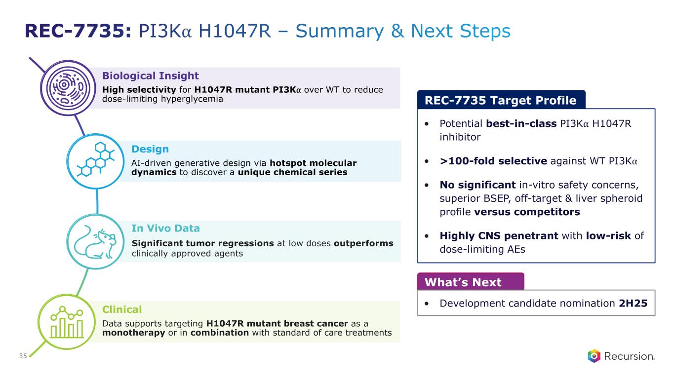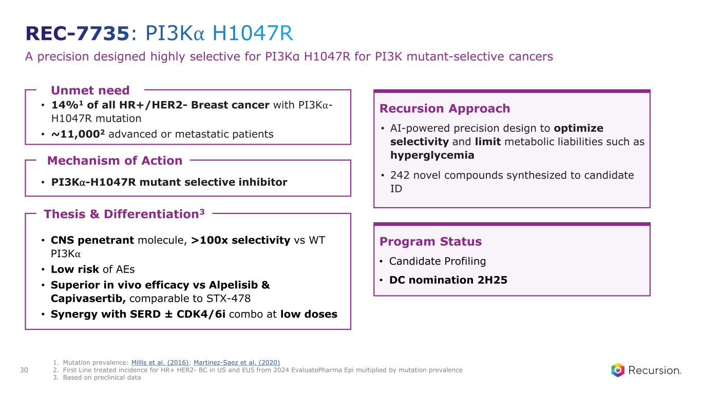 A precision designed highly selective for PI3Kα H1047R for PI3K mutant-selective cancers Unmet need • 14%1 of all HR+/HER2- Breast cancer with PI3K⍺- H1047R mutation • ~11,0002 advanced or metastatic patients Thesis & Differentiation3 • CNS penetrant molecule, >100x selectivity vs WT PI3K⍺ • Low risk of AEs • Superior in vivo efficacy vs Alpelisib & Capivasertib, comparable to STX-478 • Synergy with SERD ± CDK4/6i combo at low doses Recursion Approach • AI-powered precision design to optimize selectivity and limit metabolic liabilities such as hyperglycemia • 242 novel compounds synthesized to candidate ID Program Status • Candidate Profiling • DC nomination 2H25 Mechanism of Action • PI3K⍺-H1047R mutant selective inhibitor 1. Mutation prevalence: Millis et al. (2016); Martinez-Saez et al. (2020) 2. First Line treated incidence for HR+ HER2- BC in US and EU5 from 2024 EvaluatePharma Epi multiplied by mutation prevalence 3. Based on preclinical data 30