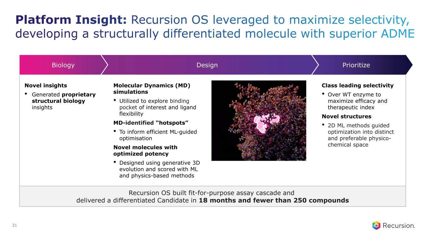 Recursion OS built fit-for-purpose assay cascade and delivered a differentiated Candidate in 18 months and fewer than 250 compounds PrioritizeDesignBiology Novel insights • Generated proprietary structural biology insights Molecular Dynamics (MD) simulations • Utilized to explore binding pocket of interest and ligand flexibility MD-identified “hotspots” • To inform efficient ML-guided optimisation Novel molecules with optimized potency • Designed using generative 3D evolution and scored with ML and physics-based methods Class leading selectivity • Over WT enzyme to maximize efficacy and therapeutic index Novel structures • 2D ML methods guided optimization into distinct and preferable physico- chemical space 31