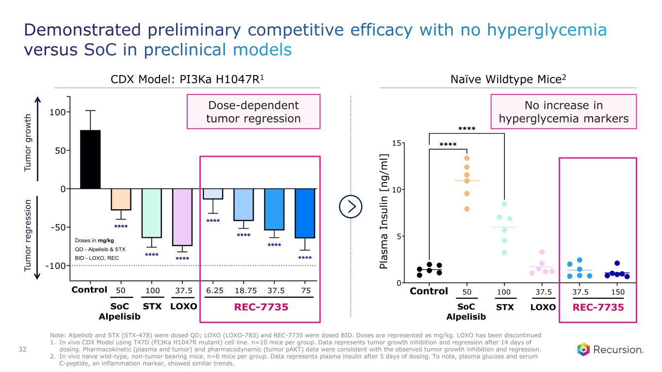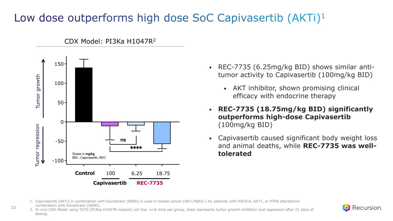 No increase in hyperglycemia markers Tu m or g ro w th Tu m or r eg re ss io n Dose-dependent tumor regression CDX Model: PI3Ka H1047R1 Naïve Wildtype Mice2 Note: Alpelisib and STX (STX-478) were dosed QD; LOXO (LOXO-783) and REC-7735 were dosed BID. Doses are represented as mg/kg. LOXO has been discontinued 1. In vivo CDX Model using T47D (PI3Ka H1047R mutant) cell line. n=10 mice per group. Data represents tumor growth inhibition and regression after 14 days of dosing. Pharmacokinetic (plasma and tumor) and pharmacodynamic (tumor pAKT) data were consistent with the observed tumor growth inhibition and regression. 2. In vivo naive wild-type, non-tumor bearing mice. n=6 mice per group. Data represents plasma insulin after 5 days of dosing. To note, plasma glucose and serum C-peptide, an inflammation marker, showed similar trends. 32