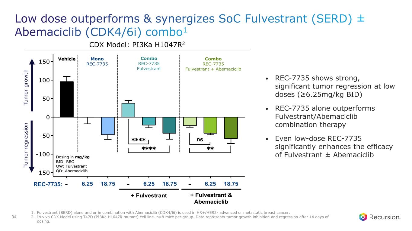 Tu m or g ro w th Tu m or r eg re ss io n • REC-7735 (6.25mg/kg BID) shows similar anti- tumor activity to Capivasertib (100mg/kg BID) • AKT inhibitor, shown promising clinical efficacy with endocrine therapy • REC-7735 (18.75mg/kg BID) significantly outperforms high-dose Capivasertib (100mg/kg BID) • Capivasertib caused significant body weight loss and animal deaths, while REC-7735 was well- tolerated CDX Model: PI3Ka H1047R2 1. Capivasertib (AKTi) in combination with fulvestrant (SERD) is used in breast cancer (HR+/HER2-) for patients with PIK3CA, AKT1, or PTEN alterationin combination with fulvestrant (SERD). 2. In vivo CDX Model using T47D (PI3Ka H1047R mutant) cell line. n=8 mice per group. Data represents tumor growth inhibition and regression after 21 days of dosing. 33