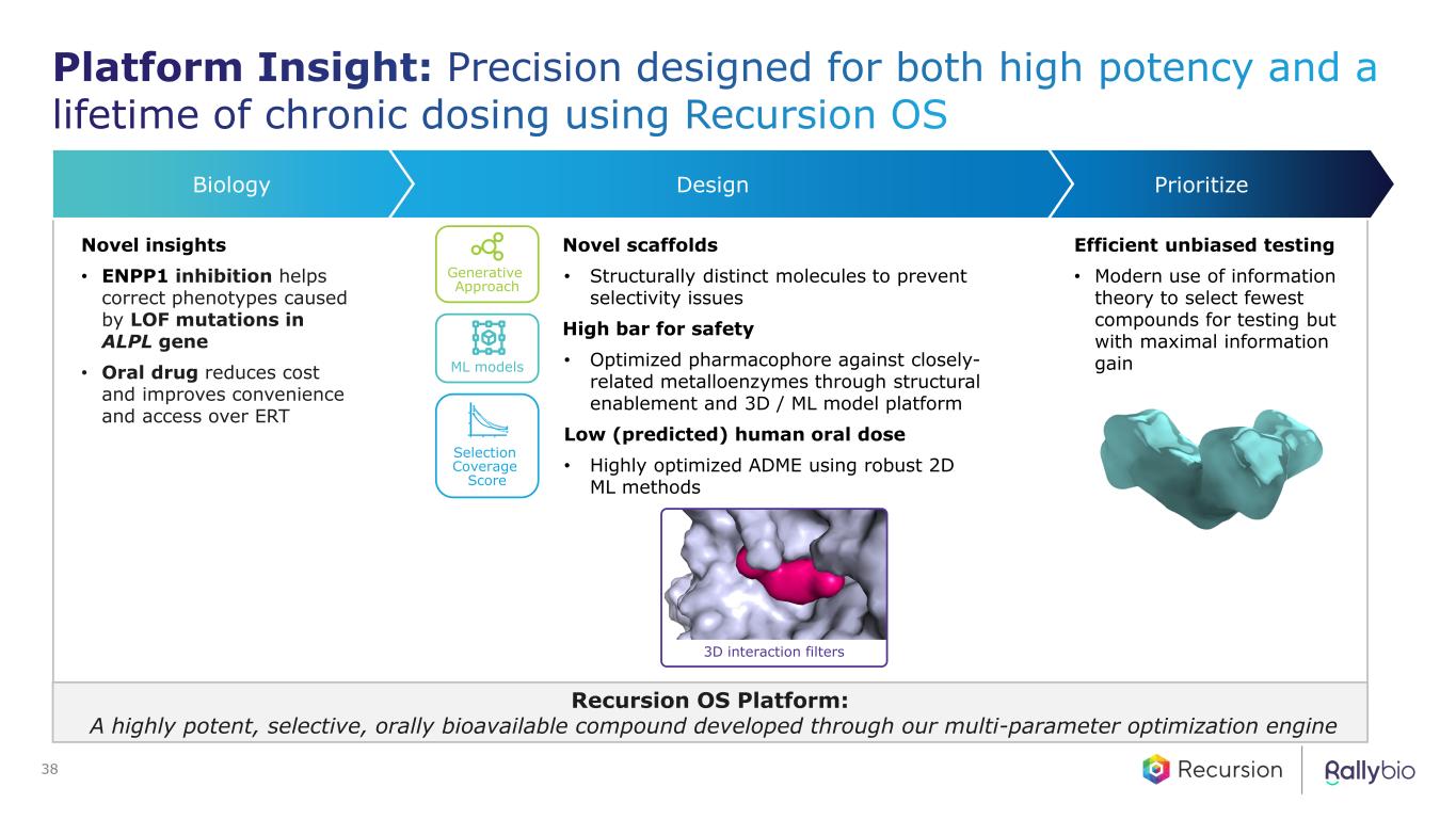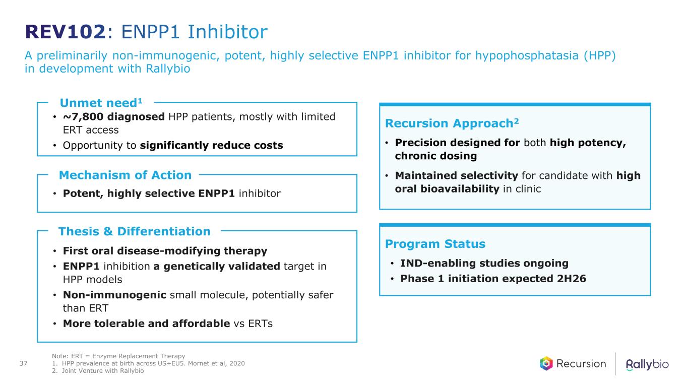 A preliminarily non-immunogenic, potent, highly selective ENPP1 inhibitor for hypophosphatasia (HPP) in development with Rallybio Unmet need1 • ~7,800 diagnosed HPP patients, mostly with limited ERT access • Opportunity to significantly reduce costs Thesis & Differentiation • First oral disease-modifying therapy • ENPP1 inhibition a genetically validated target in HPP models • Non-immunogenic small molecule, potentially safer than ERT • More tolerable and affordable vs ERTs Recursion Approach2 • Precision designed for both high potency, chronic dosing • Maintained selectivity for candidate with high oral bioavailability in clinic Program Status • IND-enabling studies ongoing • Phase 1 initiation expected 2H26 Mechanism of Action • Potent, highly selective ENPP1 inhibitor Note: ERT = Enzyme Replacement Therapy 1. HPP prevalence at birth across US+EU5. Mornet et al, 2020 2. Joint Venture with Rallybio 37