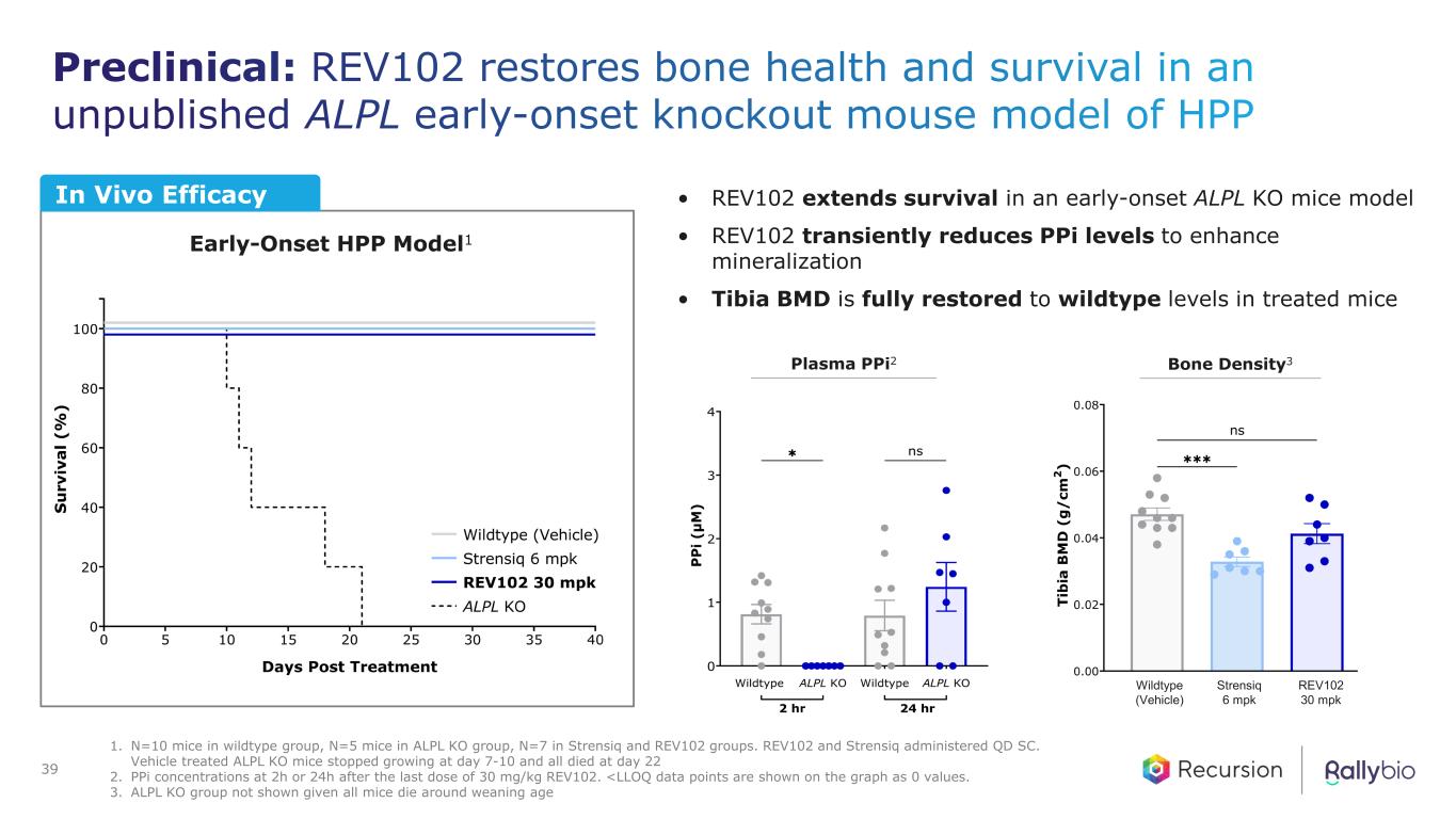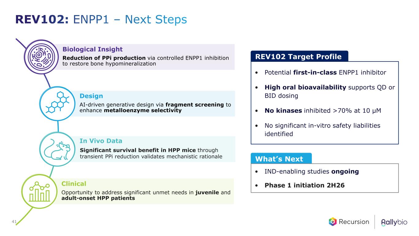 Biological Insight Reduction of PPi production via controlled ENPP1 inhibition to restore bone hypomineralization Design AI-driven generative design via fragment screening to enhance metalloenzyme selectivity In Vivo Data Significant survival benefit in HPP mice through transient PPi reduction validates mechanistic rationale Clinical Opportunity to address significant unmet needs in juvenile and adult-onset HPP patients REV102 Target Profile • Potential first-in-class ENPP1 inhibitor • High oral bioavailability supports QD or BID dosing • No kinases inhibited >70% at 10 µM • No significant in-vitro safety liabilities identified What’s Next • IND-enabling studies ongoing • Phase 1 initiation 2H26 41
