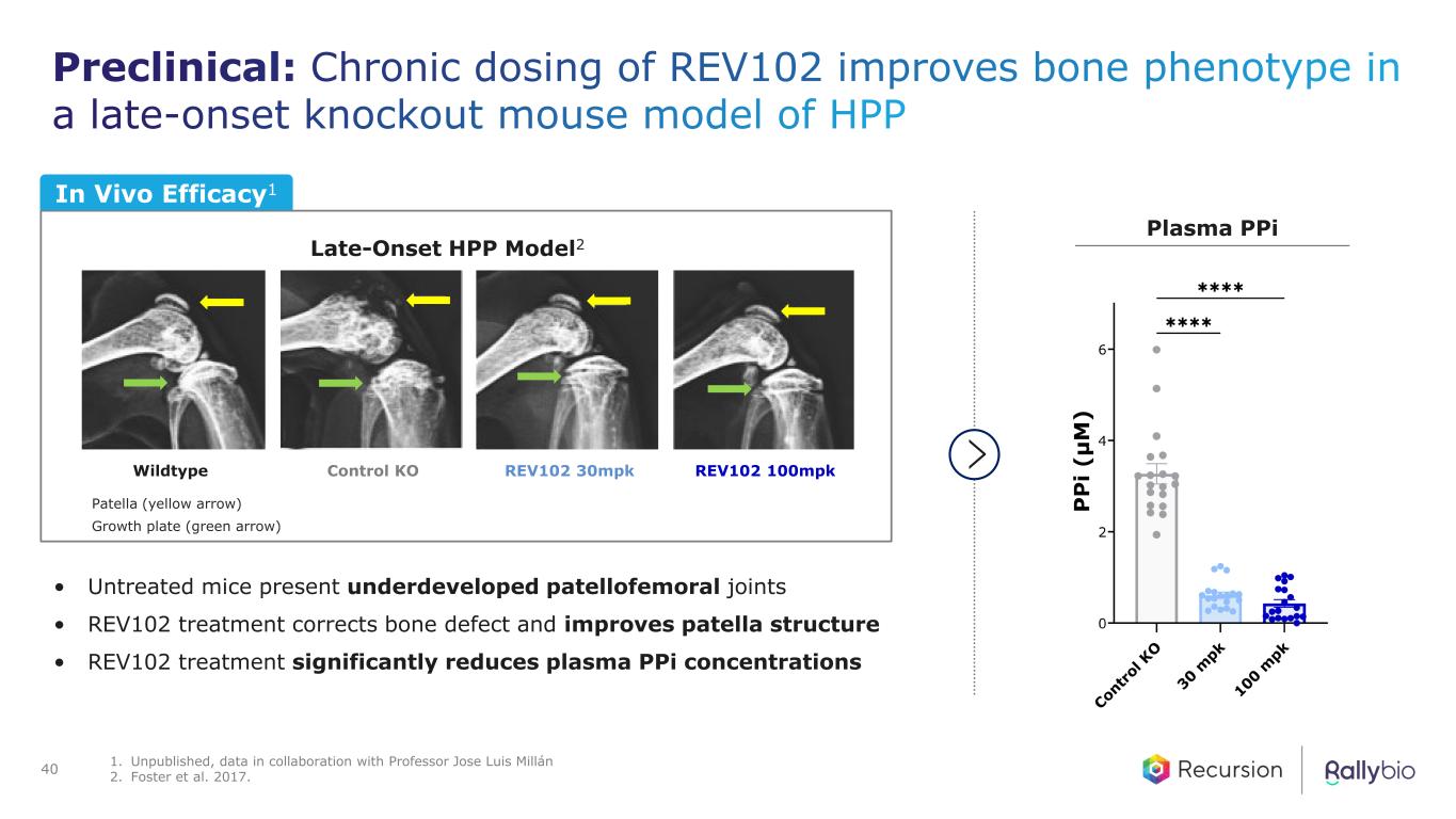 • REV102 extends survival in an early-onset ALPL KO mice model • REV102 transiently reduces PPi levels to enhance mineralization • Tibia BMD is fully restored to wildtype levels in treated mice In Vivo Efficacy Early-Onset HPP Model1 Plasma PPi2 Bone Density3 Wildtype (Vehicle) Strensiq 6 mpk REV102 30 mpk 1. N=10 mice in wildtype group, N=5 mice in ALPL KO group, N=7 in Strensiq and REV102 groups. REV102 and Strensiq administered QD SC. Vehicle treated ALPL KO mice stopped growing at day 7-10 and all died at day 22 2. PPi concentrations at 2h or 24h after the last dose of 30 mg/kg REV102. <LLOQ data points are shown on the graph as 0 values. 3. ALPL KO group not shown given all mice die around weaning age 39