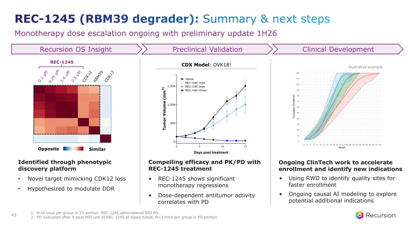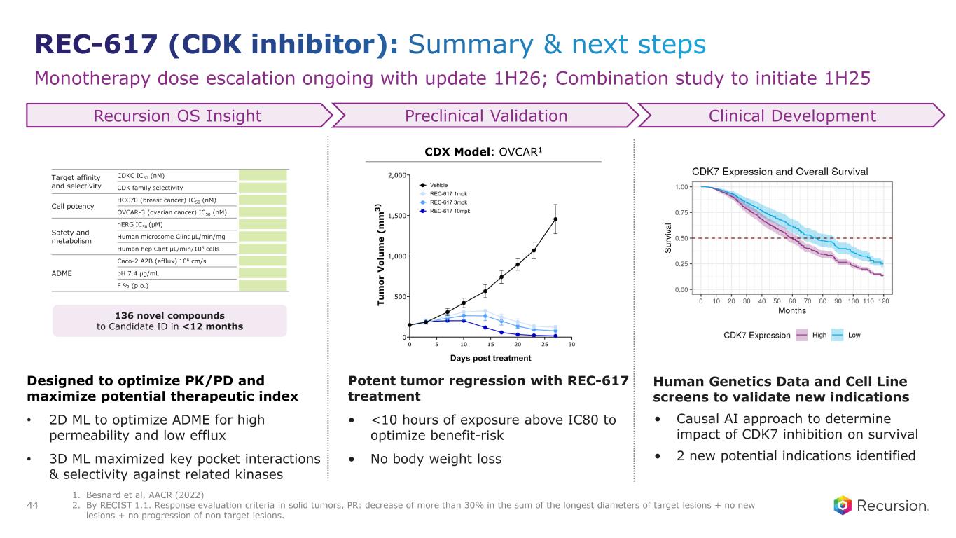 Monotherapy dose escalation ongoing with preliminary update 1H26 CDX Model: OVK181 SimilarOpposite REC-1245 Ongoing ClinTech work to accelerate enrollment and identify new indications • Using RWD to identify quality sites for faster enrollment • Ongoing causal AI modeling to explore potential additional indications Compelling efficacy and PK/PD with REC-1245 treatment • REC-1245 shows significant monotherapy regressions • Dose-dependent antitumor activity correlates with PD Identified through phenotypic discovery platform • Novel target mimicking CDK12 loss • Hypothesized to modulate DDR Clinical Development Recursion OS Insight Preclinical Validation Illustrative example 1. N=8 mice per group in TV portion. REC-1245 administered BID PO. 2. PD evaluated after 5 days BID oral of REC-1245 at doses noted; N=3 mice per group in PD portion.43