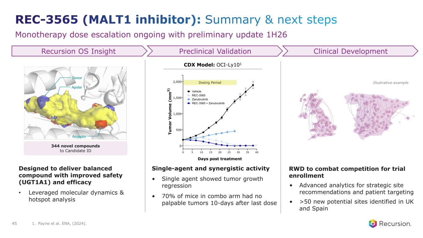 Monotherapy dose escalation ongoing with preliminary update 1H26 RWD to combat competition for trial enrollment • Advanced analytics for strategic site recommendations and patient targeting • >50 new potential sites identified in UK and Spain Single-agent and synergistic activity • Single agent showed tumor growth regression • 70% of mice in combo arm had no palpable tumors 10-days after last dose Designed to deliver balanced compound with improved safety (UGT1A1) and efficacy • Leveraged molecular dynamics & hotspot analysis Clinical Development Recursion OS Insight Preclinical Validation CDX Model: OCI-Ly101 Illustrative example 344 novel compounds to Candidate ID 45 1. Payne et al. ENA, (2024).