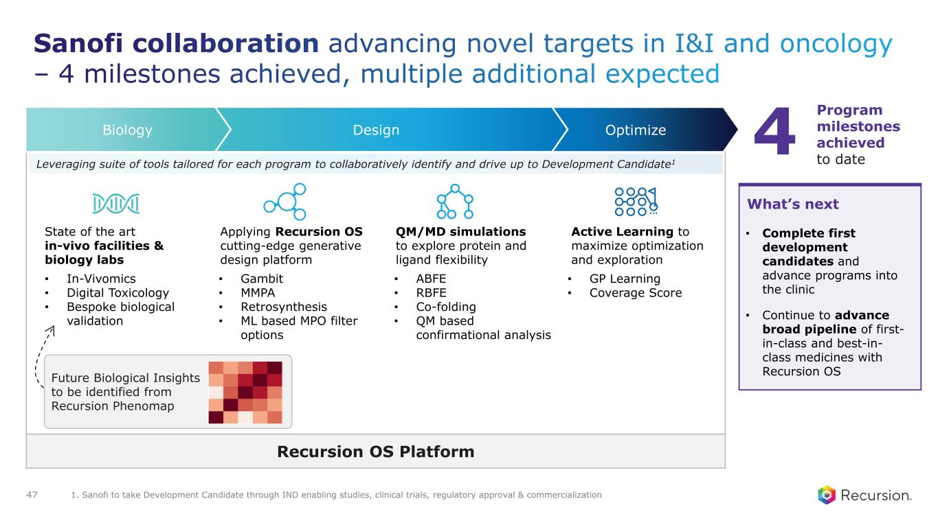 OptimizeDesignBiology QM/MD simulations to explore protein and ligand flexibility Applying Recursion OS cutting-edge generative design platform Active Learning to maximize optimization and exploration 4 Program milestones achieved to date • Complete first development candidates and advance programs into the clinic • Continue to advance broad pipeline of first- in-class and best-in- class medicines with Recursion OS What’s next Future Biological Insights to be identified from Recursion Phenomap • Gambit • MMPA • Retrosynthesis • ML based MPO filter options • ABFE • RBFE • Co-folding • QM based confirmational analysis • GP Learning • Coverage Score State of the art in-vivo facilities & biology labs • In-Vivomics • Digital Toxicology • Bespoke biological validation Leveraging suite of tools tailored for each program to collaboratively identify and drive up to Development Candidate1 Recursion OS Platform 1. Sanofi to take Development Candidate through IND enabling studies, clinical trials, regulatory approval & commercialization 47