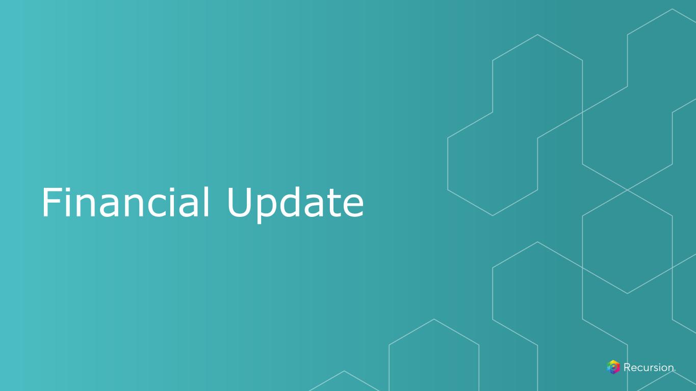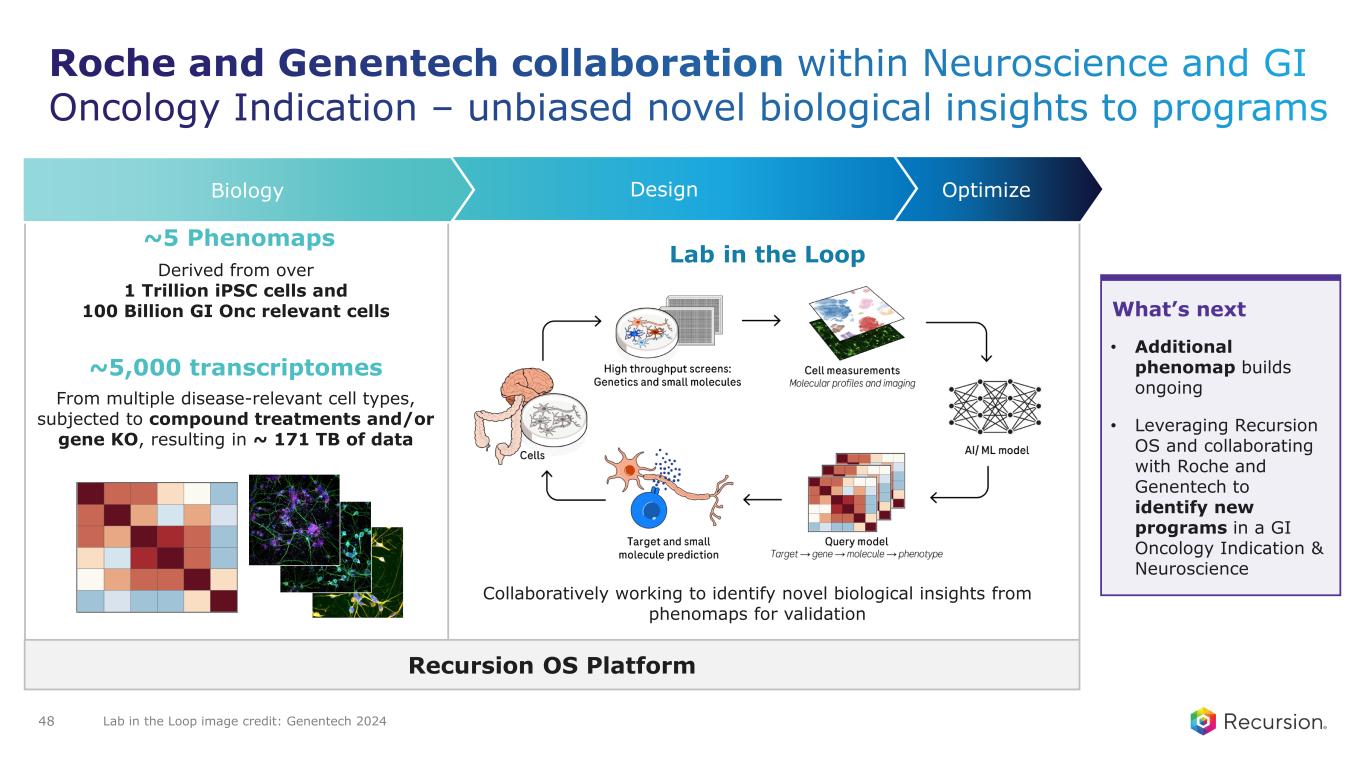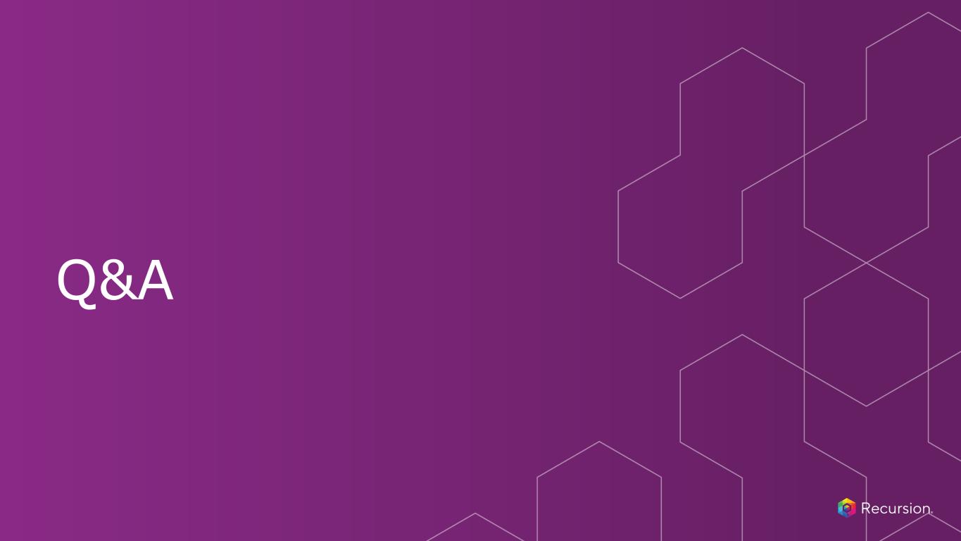 ~5 Phenomaps • Additional phenomap builds ongoing • Leveraging Recursion OS and collaborating with Roche and Genentech to identify new programs in a GI Oncology Indication & Neuroscience What’s next Collaboratively working to identify novel biological insights from phenomaps for validation Lab in the Loop Derived from over 1 Trillion iPSC cells and 100 Billion GI Onc relevant cells ~5,000 transcriptomes Recursion OS Platform From multiple disease-relevant cell types, subjected to compound treatments and/or gene KO, resulting in ~ 171 TB of data OptimizeDesignBiology Lab in the Loop image credit: Genentech 202448