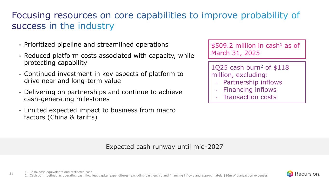 • Prioritized pipeline and streamlined operations • Reduced platform costs associated with capacity, while protecting capability • Continued investment in key aspects of platform to drive near and long-term value • Delivering on partnerships and continue to achieve cash-generating milestones • Limited expected impact to business from macro factors (China & tariffs) $509.2 million in cash1 as of March 31, 2025 1Q25 cash burn2 of $118 million, excluding: - Partnership inflows - Financing inflows - Transaction costs Expected cash runway until mid-2027 1. Cash, cash equivalents and restricted cash 2. Cash burn, defined as operating cash flow less capital expenditures, excluding partnership and financing inflows and approximately $16m of transaction expenses 51
