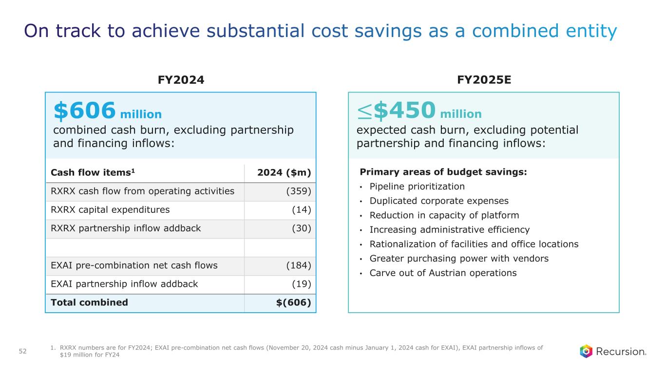 Cash flow items1 2024 ($m) RXRX cash flow from operating activities (359) RXRX capital expenditures (14) RXRX partnership inflow addback (30) EXAI pre-combination net cash flows (184) EXAI partnership inflow addback (19) Total combined $(606) Primary areas of budget savings: • Pipeline prioritization • Duplicated corporate expenses • Reduction in capacity of platform • Increasing administrative efficiency • Rationalization of facilities and office locations • Greater purchasing power with vendors • Carve out of Austrian operations $606 million combined cash burn, excluding partnership and financing inflows: ≤$450 million expected cash burn, excluding potential partnership and financing inflows: FY2024 FY2025E 1. RXRX numbers are for FY2024; EXAI pre-combination net cash flows (November 20, 2024 cash minus January 1, 2024 cash for EXAI), EXAI partnership inflows of $19 million for FY24 52
